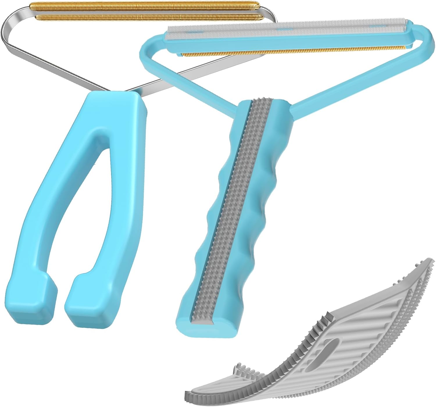 • WIDELY USE:3 Types Reusable Pet Hair Remover for Different Materials --- Copper pet hair remover be used for heavy duty and thick piled items, such as carpet, rug, couch, furniture, blanket, cat tree, car interiors, winter coats and etc. Plastic fabric shaver can be used for soft and thin fabrics, like upholstery, ottoman, velvet, bed sheet, sweatshirt and etc. Soft Rubber Brush:Crafted from premium TPR, This product embodies safety, reliability, and meticulous craftsmanship,its high-quality build provides peace of mind during grooming.Easily remove pet hair from curved surfaces and corners