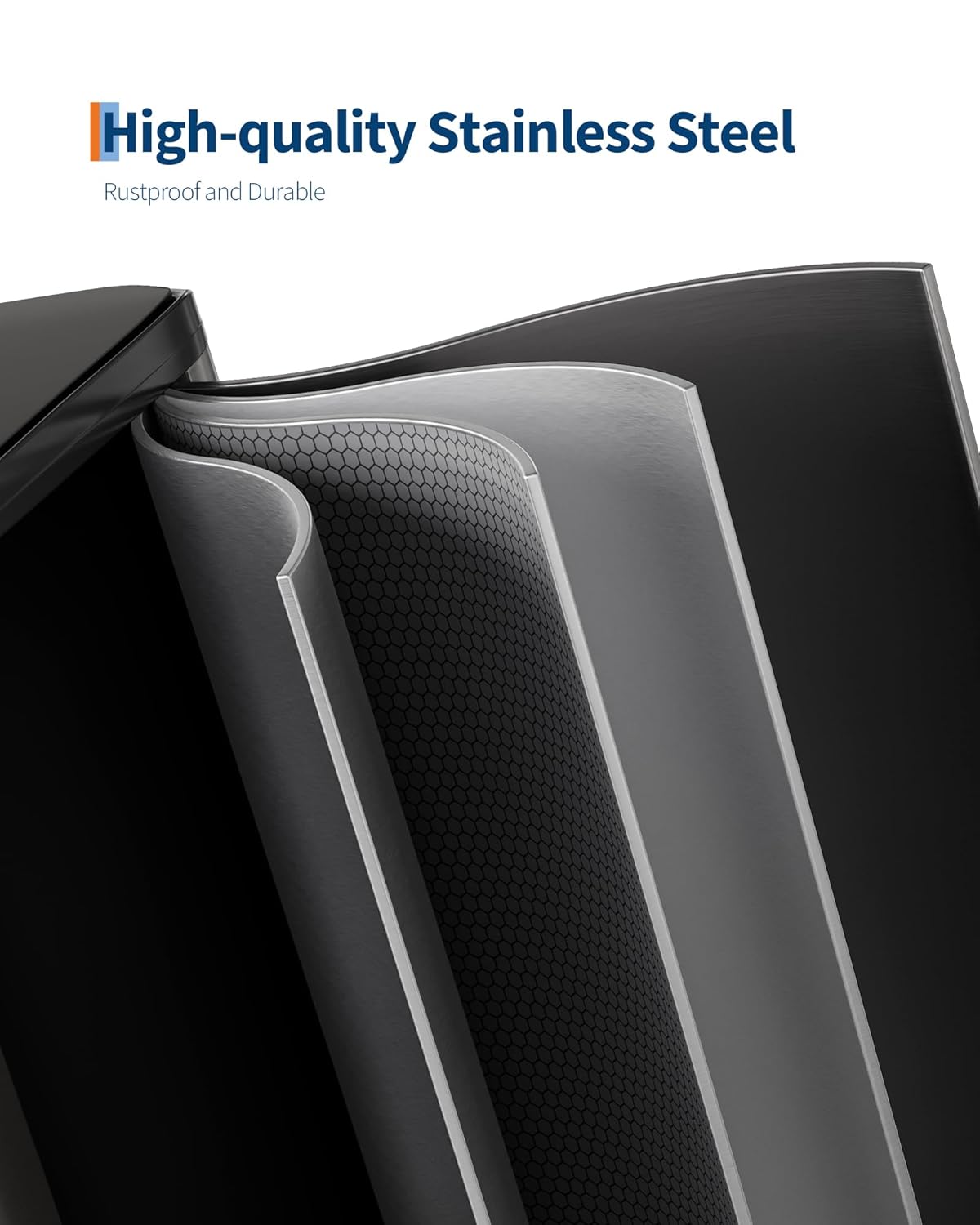 • [HIGH-QUALITY MATERIALS] – GarveeHome stainless steel trash can with lid is engineered for longevity. Its 410 Garade ferritic stainless-steel shell delivers rustproof strength, scratch resistance and lasting luster. Two polypropylene inner buckets repel stains, odors and moisture. A thick ABS lid with stainless overlay resists dents; the industrial steel pedal endures 150,000+ steps and the one-piece ABS hinge survives over 300,000 open/close cycles