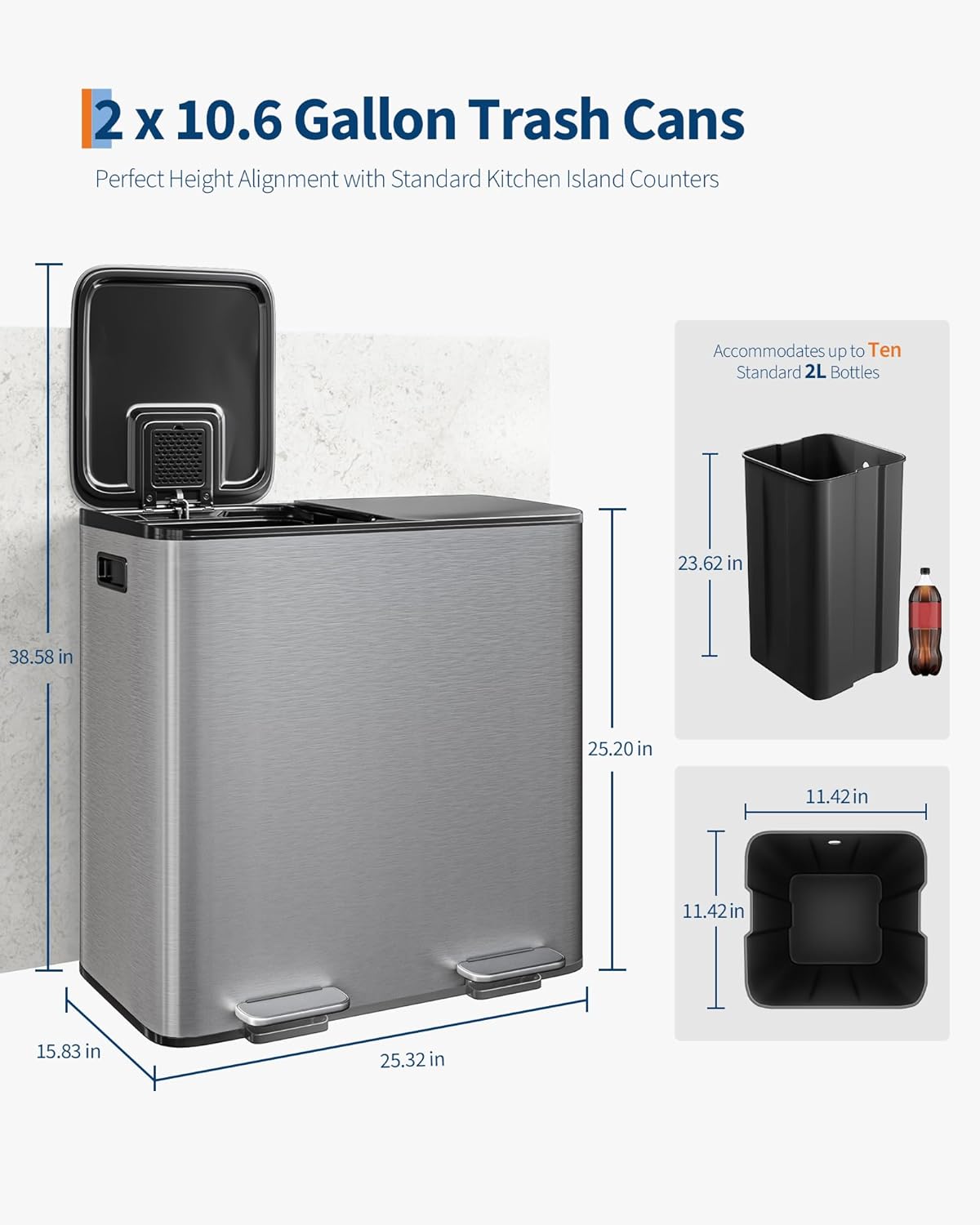 • [SLEEK AESTHETIC, COMPACT FOOTPRINT] – GarveeHome large double kitchen trash cans delivers a refined profile at 25.32 in L × 15.83 in W × 25.20 in H when closed, extending to 38.58 in H at full lid opening—just 2.58 in above a standard 36 in island countertop for perfect alignment. Each removable inner basket (11.42 in W × 11.42 in D × 23.62 in H) accommodates up to 24 standard 16.9 oz water bottles or 48 12 oz cans, maximizing sorting capacity without encroaching on your floor space
