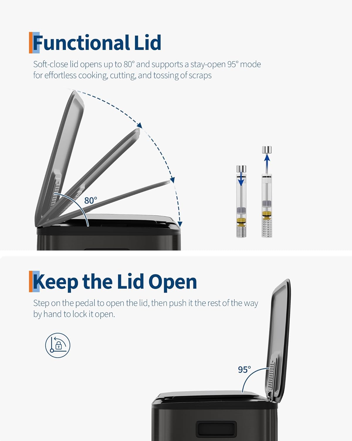 • [PRACTICAL DESIGN] – GarveeHome’s dual trash and recycling bins put ease of use first. Ergonomic side handles let you lift and relocate the entire unit effortlessly. The soft-close lid opens to 80° without collision with standard kitchen island edges, and locks at 95° for hands-free cooking prep and scrap disposal. Dual inner buckets with weighted-edge lids trap odors separately. A custom liner ring secures any standard bag snugly, eliminating slips, bunching, and overhang