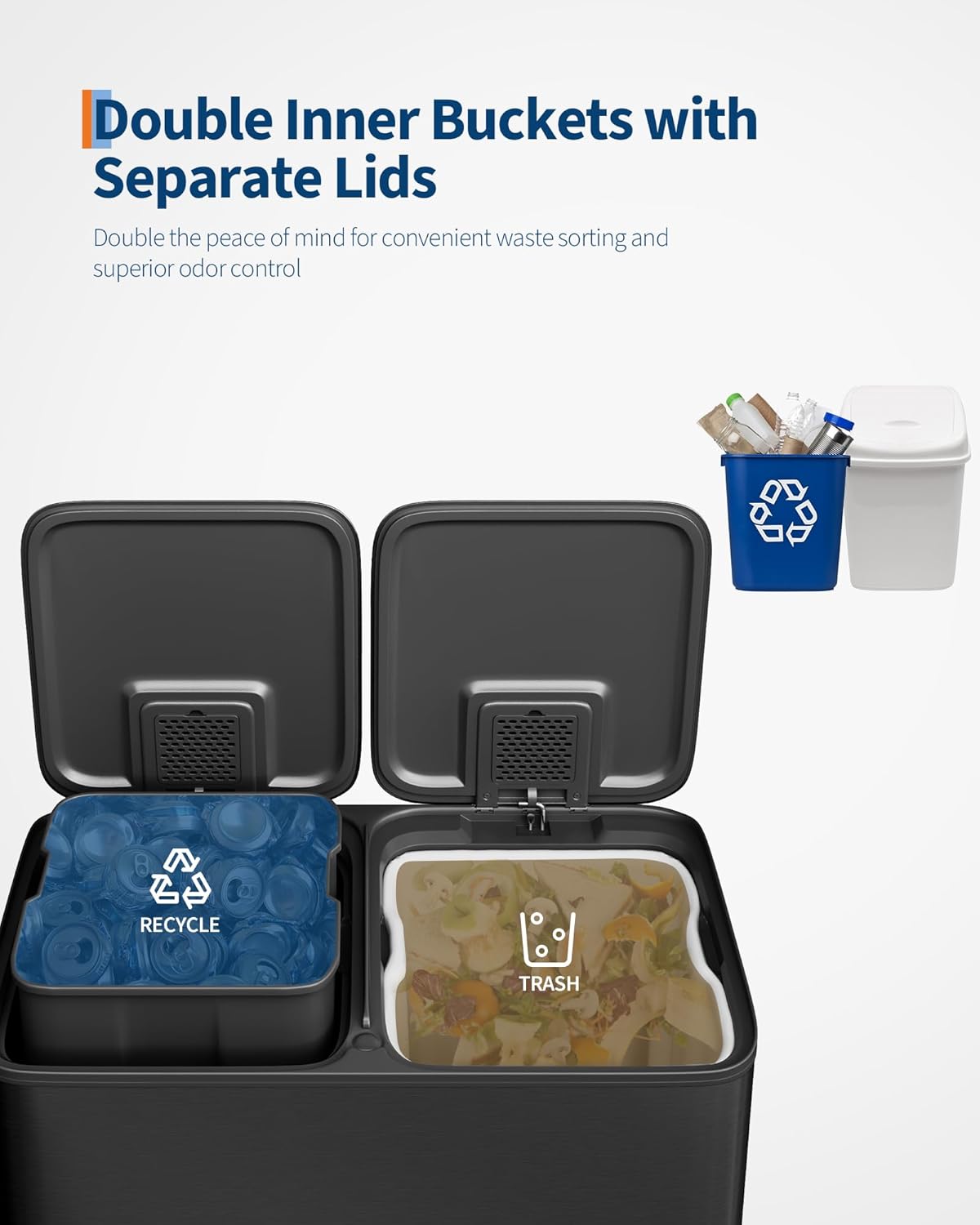GarveeHome 2 x 10.6 Gallon Stainless Steel Double Trash Can with Lid for Kitchen, Large Dual Trash and Recycle Bin Combo, Step-on Kitchen Metal Garbage Cans, PP Inner Buckets, Liner Rim, Matte Black