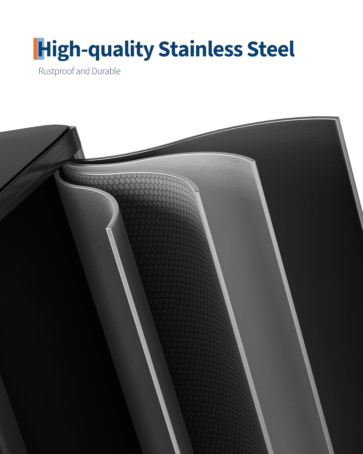 • [HIGH-QUALITY MATERIALS] – GarveeHome stainless steel trash can with lid is engineered for longevity. Its 410-grade ferritic stainless-steel shell delivers rustproof strength, scratch resistance and lasting luster. Two polypropylene inner buckets repel stains, odors and moisture. A thick ABS lid with stainless overlay resists dents; the industrial steel pedal endures 150,000+ steps and the one-piece ABS hinge survives over 300,000 open/close cycles