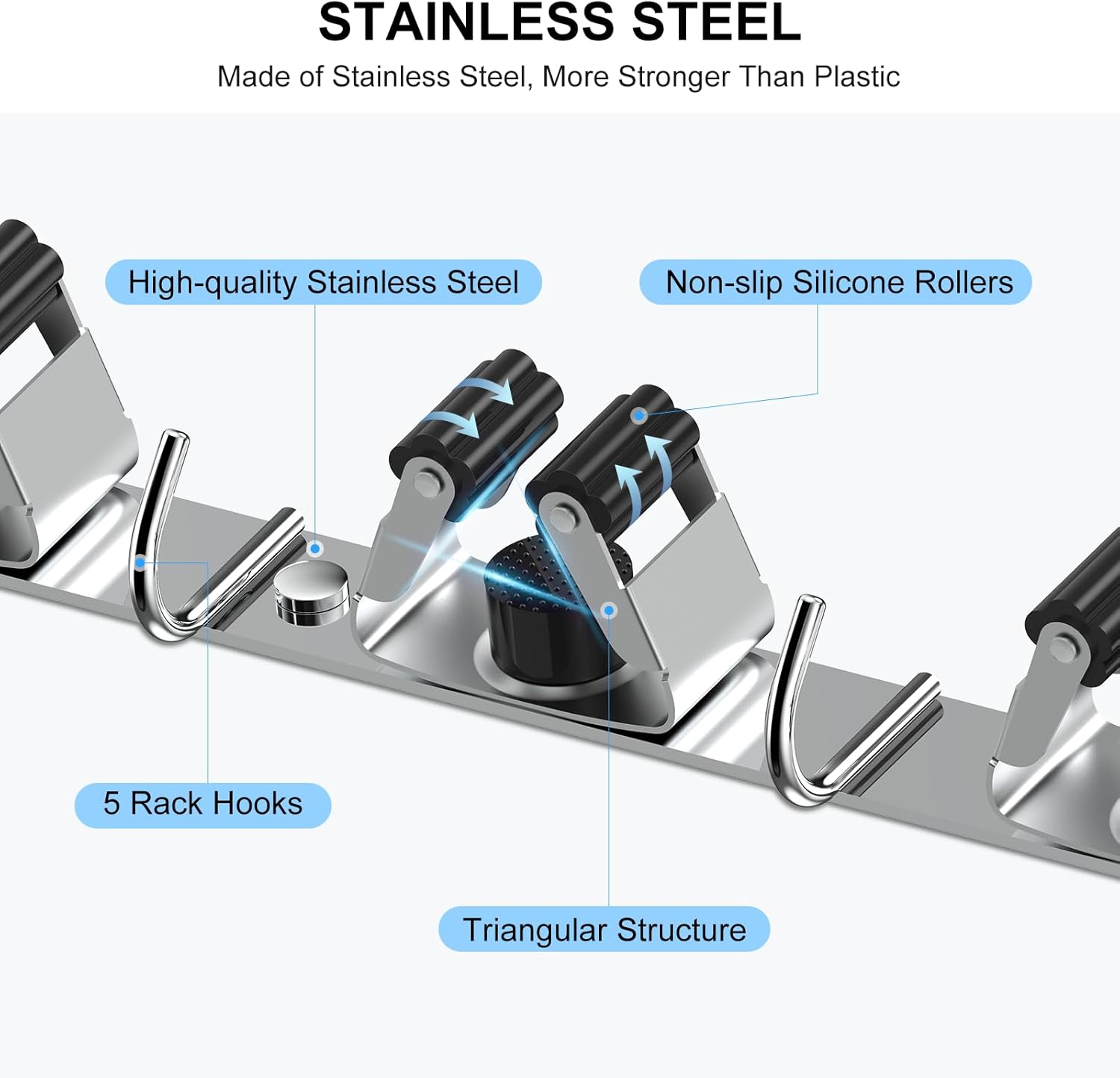 • STURDY BROOM HOLDER: Each mop and broom holder wall mount comes with 4 shelves and 5 hooks, made of high-quality stainless steel, corrosion-resistant, rust-proof, waterproof, and has a longer service life. High-quality materials make it both lightweight and durable