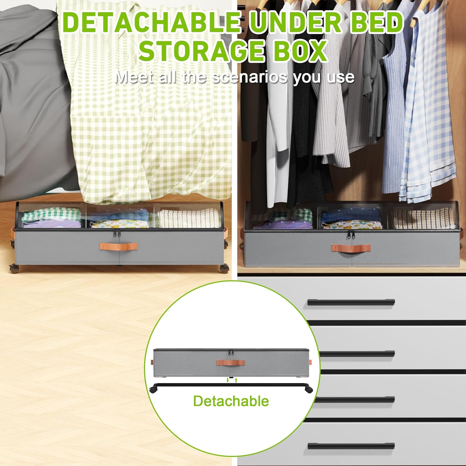 • 【360° Rotating Slide Wheels】Mobile storage no stress. Under Bed Storage Containers is equipped with 3 X side handle and 4 x 360°rotating wheels, that glide effortlessly on various surfaces. There is no sound when sliding, Beborxue Underbed storage baskets are ideal for bedrooms, living rooms, dorms, shoe cabinets, attics, basements and other places to use.