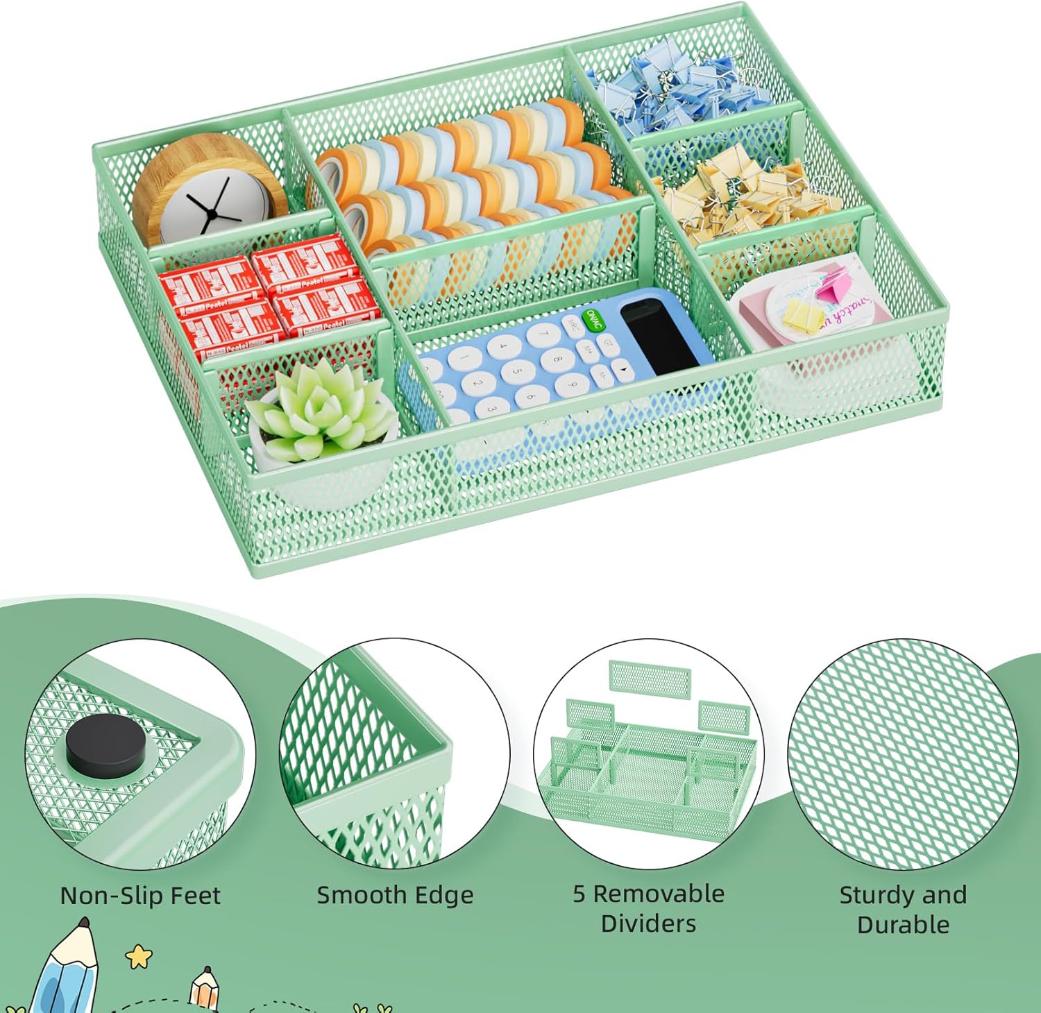Marbrasse 2 Pack Desk Drawer Organizer, Mesh Drawer Organizer Tray with 8 Adjustable Compartments, Desk Organizers and Accessories, 5 Dividers Drawer for Office Supplies, Makeup & Vanity (Green)