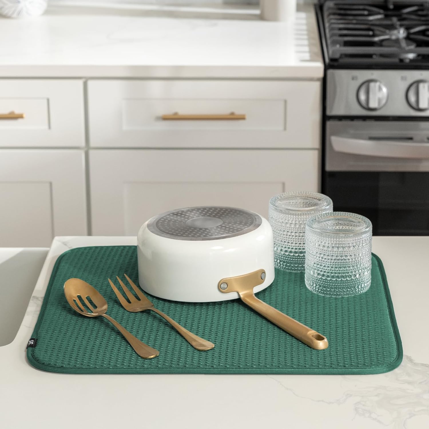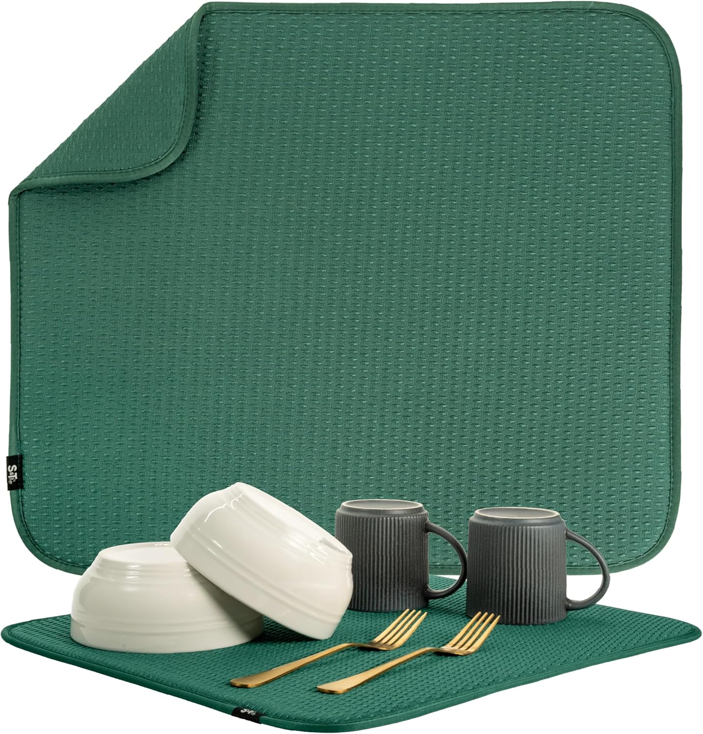 S&T INC. Dish Drying Mat, 16” x 18”, Absorbent Microfiber Kitchen Counter Mat, Drying Pad for Dishes, Utensils, Pots and Pans, Large, Diamond Texture, Emerald Green