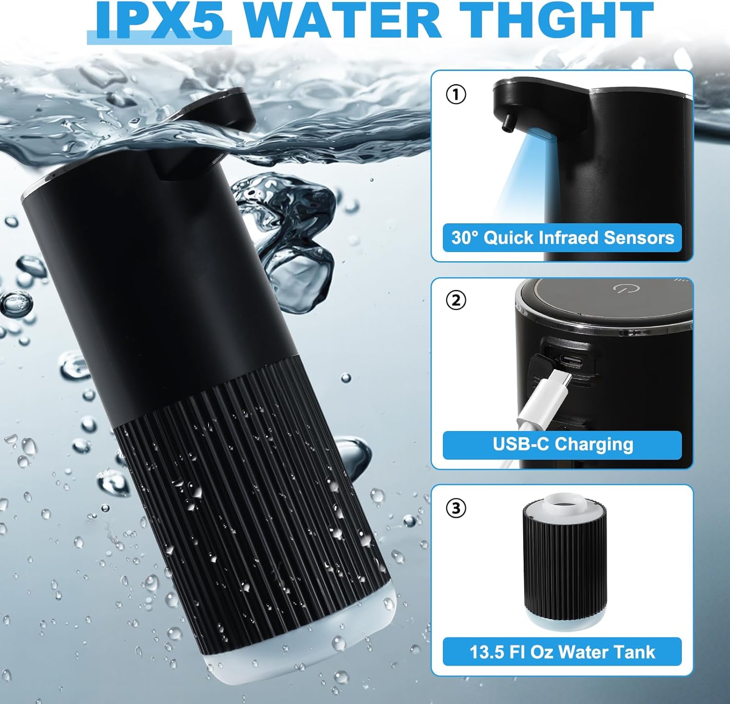 • 【IPX5 WATERTIGHT & EXTENDED BATTERY LIFE】Engineered with IPX5-rated watertight, this auto soap dispenser touchless withstands splashes in damp environments like sinks or showers. A secure rubber seal safeguards the charging port in humid conditions. The integrated 1200mAh battery supports up to 60 days of daily use on a single USB-C charge—no frequent recharging needed. (Misunderstanding due to differences in usage frequency)