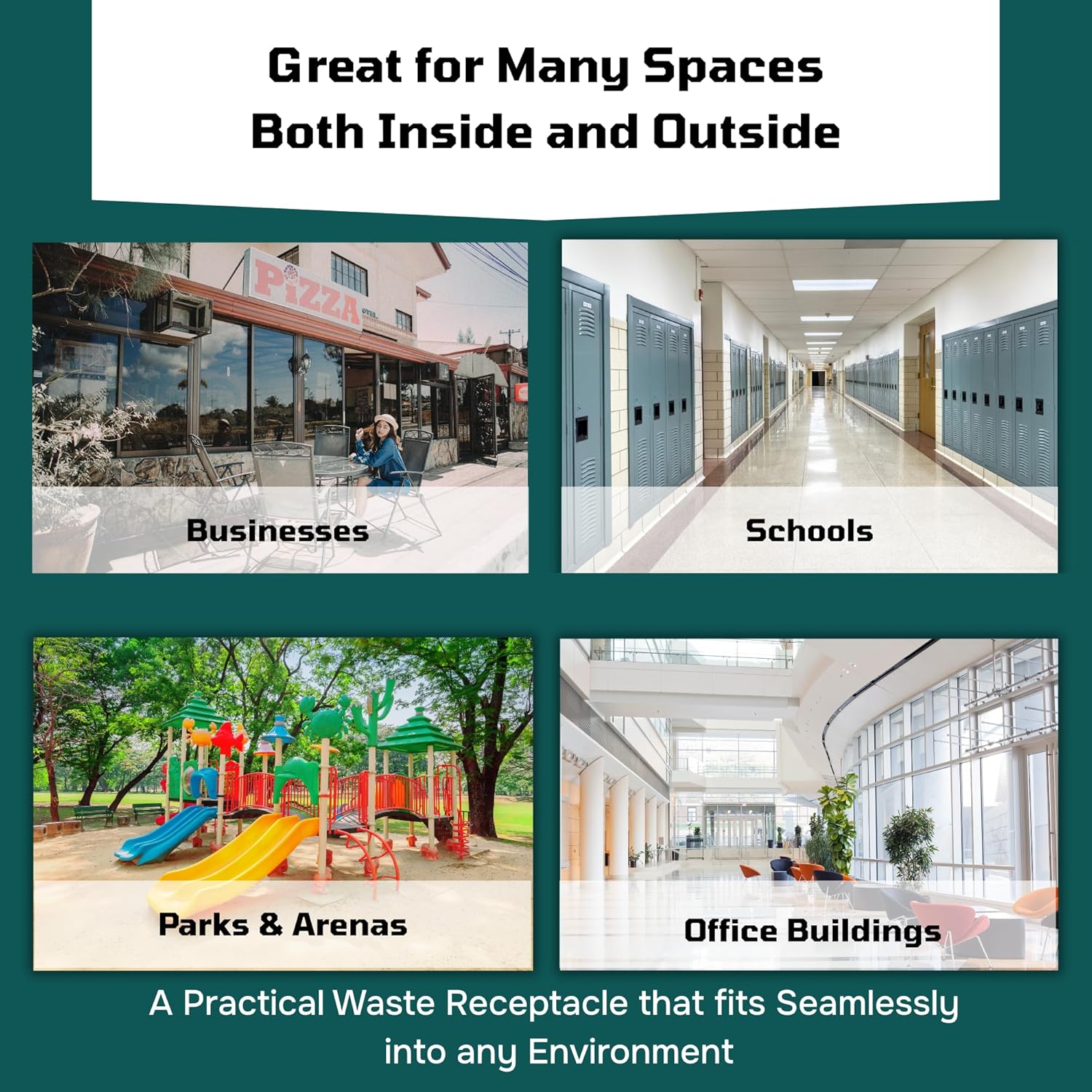 • VERSATILE USE: Perfect as a trash can for office outdoor spaces, patio trash cans, outdoor garbage cans with lid, and industrial trash cans. Designed to handle high traffic, withstand outdoor elements, and provide a long-lasting, bug proof, and pet proof waste solution.