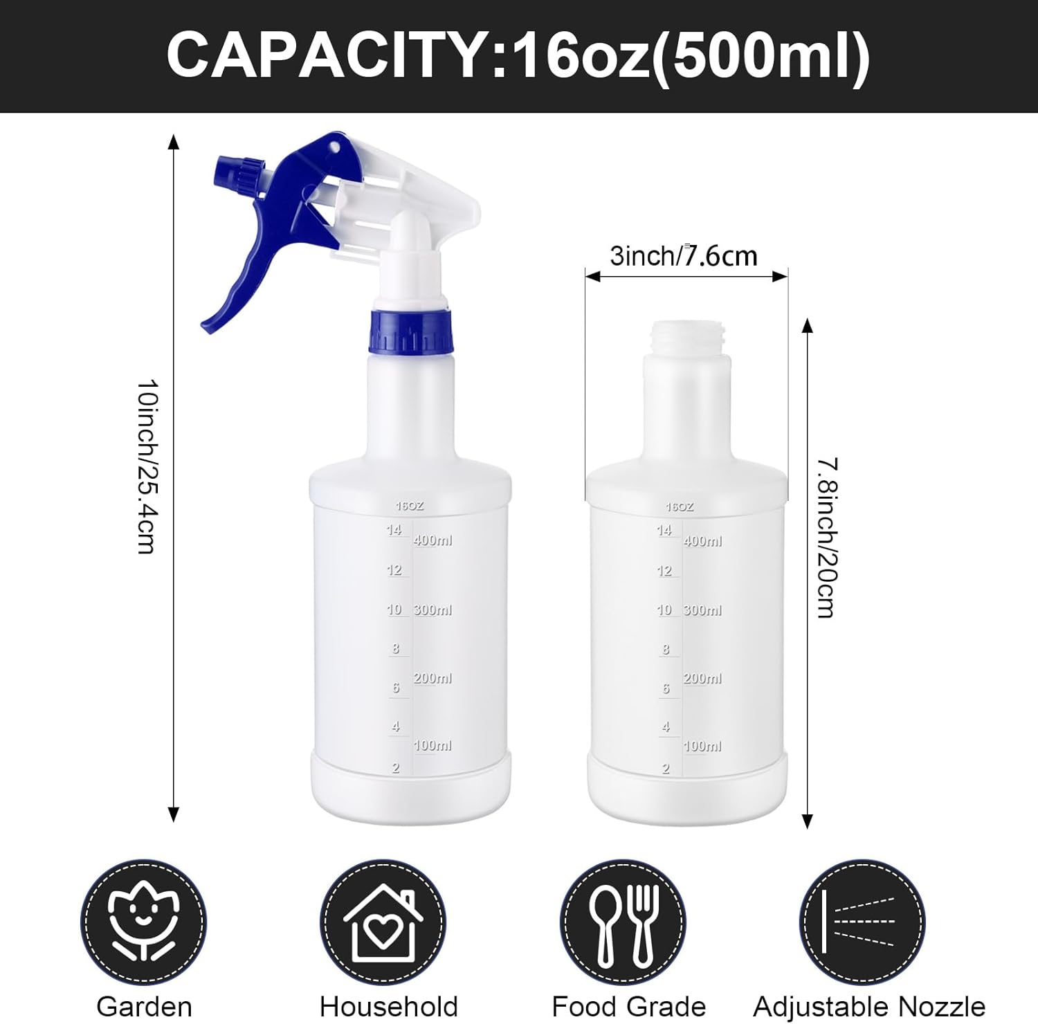 • Size and Capacity: the diameter of the empty spray bottles is approx. 6.7 cm/ 2.64 inches, the length is approx. 26 cm/ 10.24 inches, and the capacity is 500 ml/ 16 oz, suitable size to meet your various needs