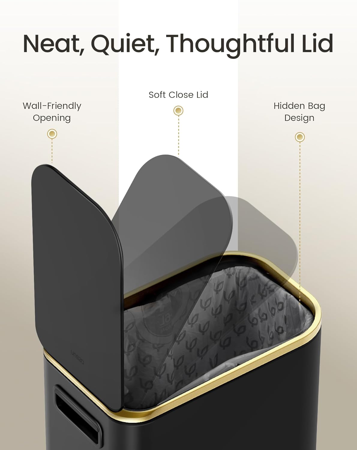 • Modern Minimalist Style: A monochrome black body paired with gold-trimmed lid edges and pedal creates elegant minimalist aesthetics. The matte finish balances metallic accents, seamlessly blending into modern, nordic or light luxury interiors to elevate your space