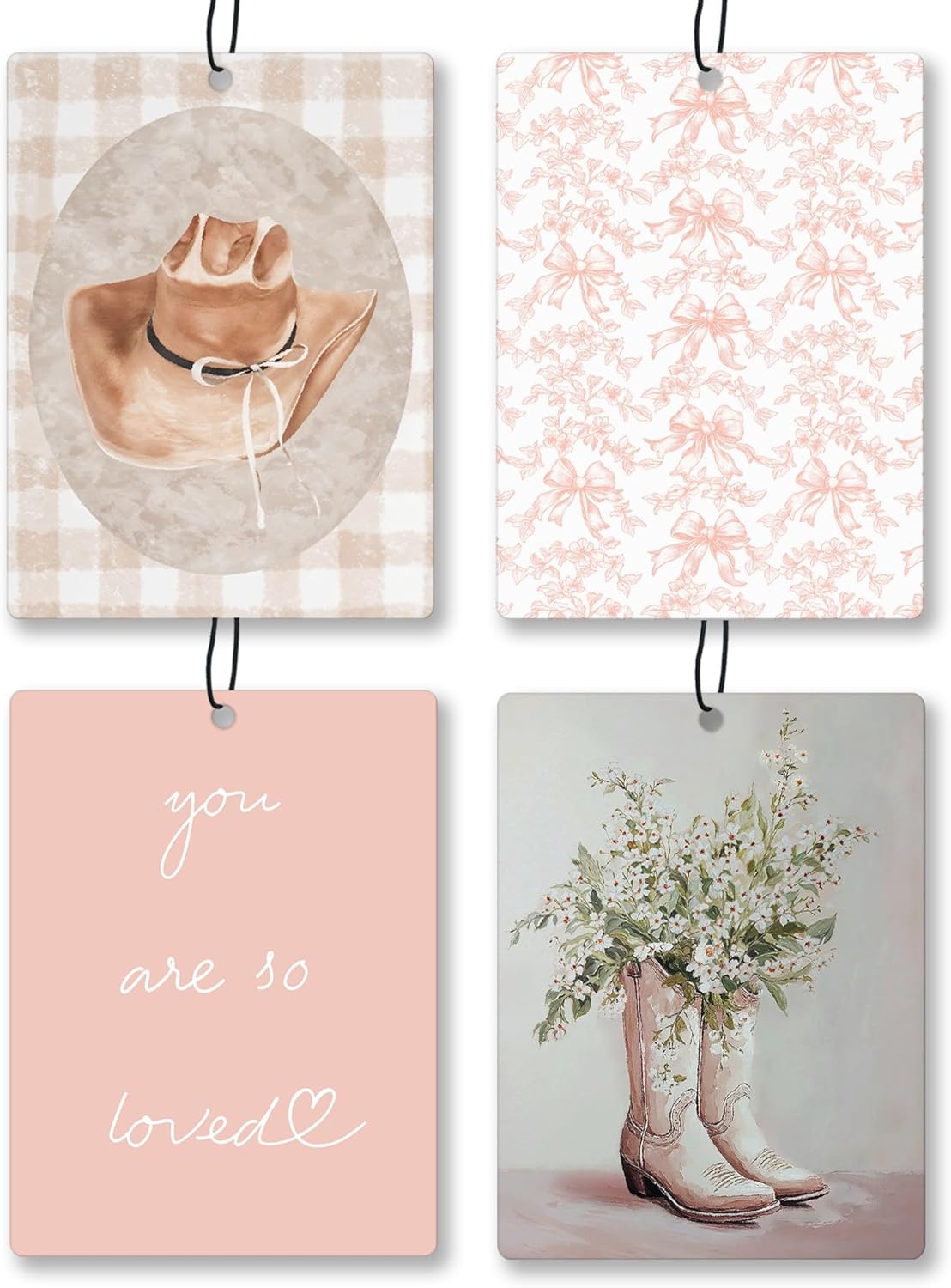 Preppy Western Cowgirl Car Air Freshener 4 Pcs, Pink Bow Floral Cowgirl Hat Boots Hanging Scents Air Freshener for Women Girls Gifts, Cute Scented Car Accessories Decor for Girls Room Nursery