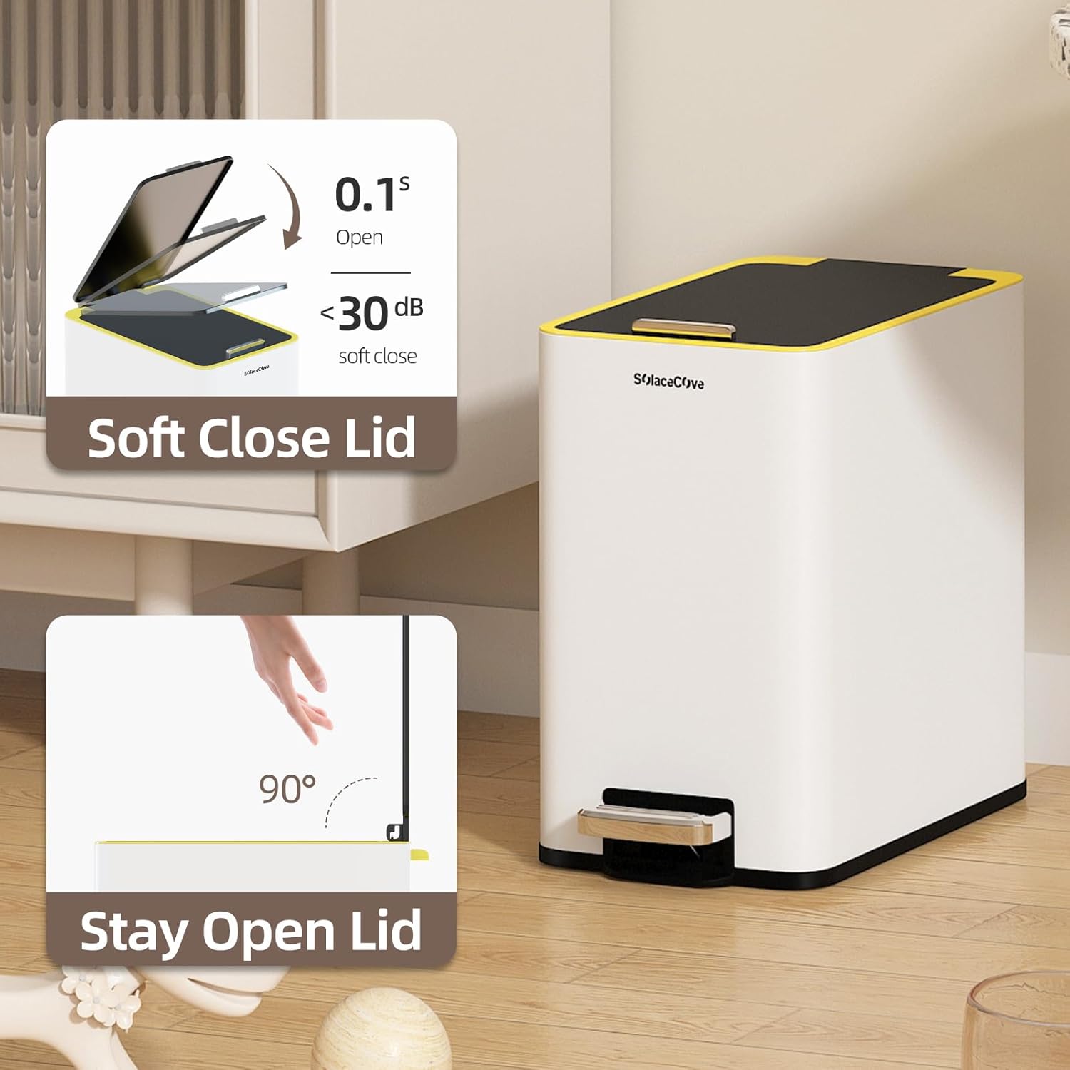 • 【Silent Step Pedal & 90°Stay-Open Lid】The soft-close mechanism operates whisper-quiet,while the lid stays securely open at 90° for hands-free use.No more loud bangs when taking out the trash!