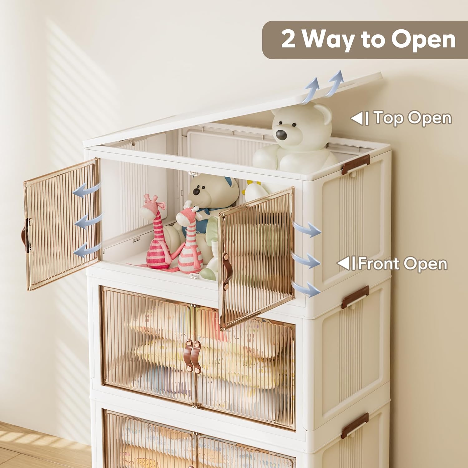 • 【Two Way Open】The bins feature front double doors or top lid openings. The magnetic lock provides easy access to the front, while the top lid allows for easy access to larger items like clothes and blankets. These bins are perfect for storage bins with drawers to enhance organization and storage.
