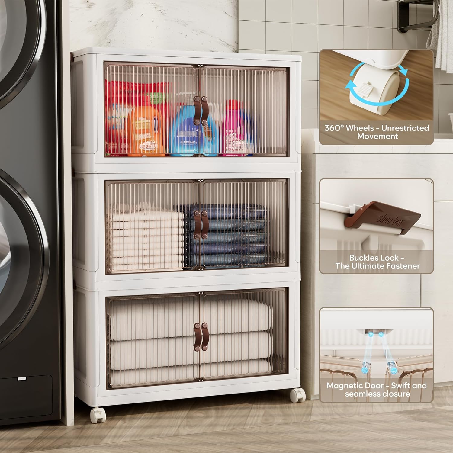 • 【Stackable & Magnetic Door & Rotating Wheels】The storage box has a groove design for stacking stackable storage bins. With side and rear buckles, the stacked boxes stay steady and secure. Equipped with four 360° rotating wheels, it’s easy to move and perfect for closet organizers and storage, keeping your space organized.