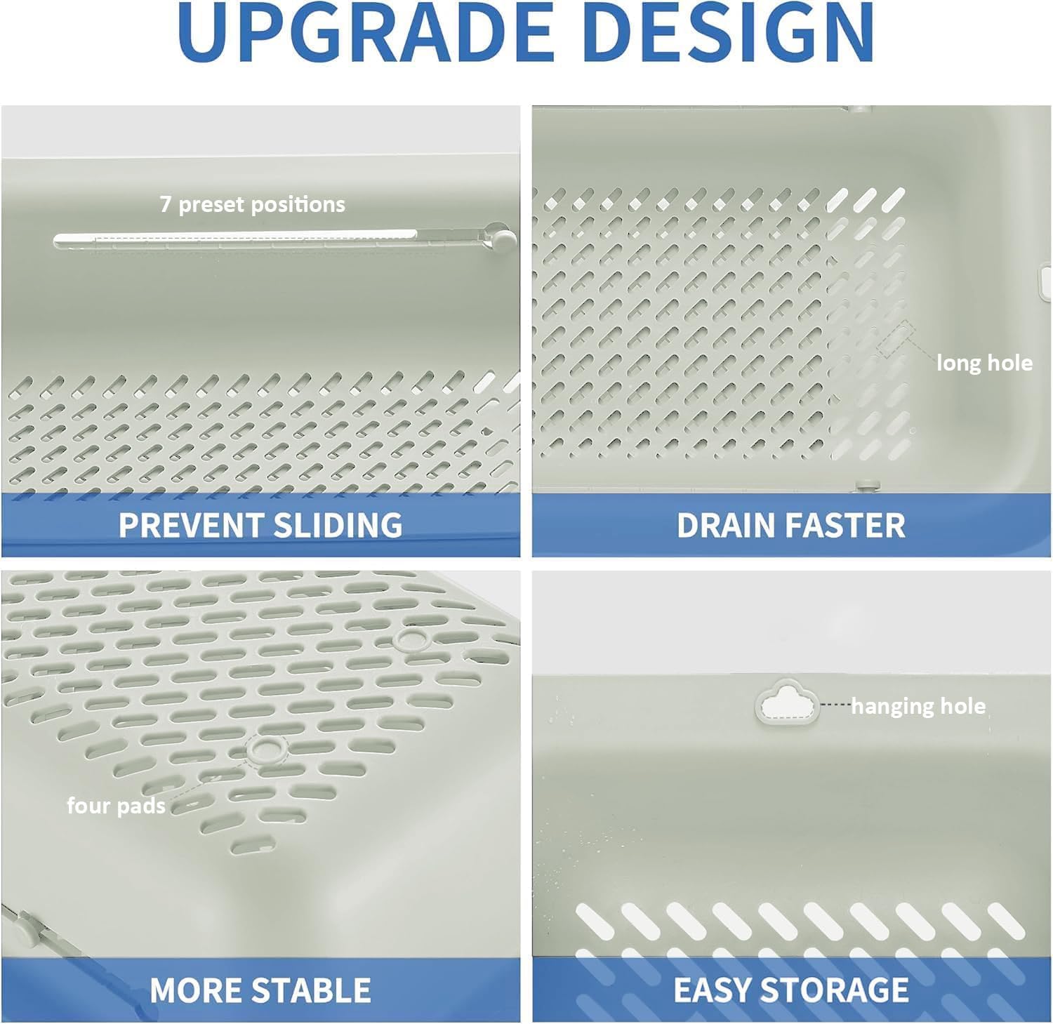 • LASSHSWA upgrade the colander, 7 preset positions - PREVENT SLIDING, long hole - DRAIN FASTER, four pads - MORE STABLE, hanging hole - EASY STORAGE.