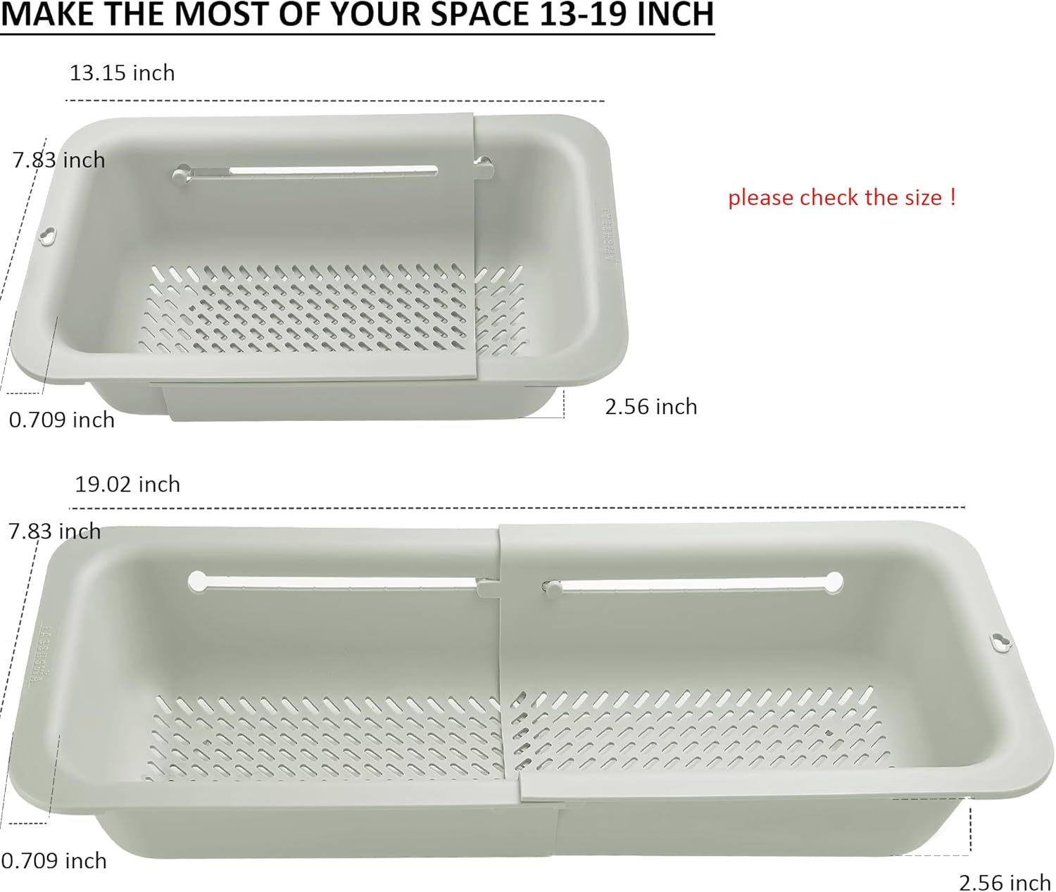 • LASSHSWA Over the sink extendable strainer, SIZE: 13-19 in (smaller space-saving design) . Stainless steel drain strainer, SIZE: Outer diameter: 4.5”; inner filter: 3”; depth: 1” . They fit for most kitchen sinks and drains.