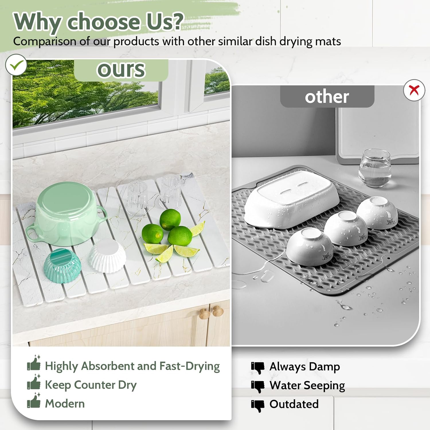 • Quick-dry stone mat kitchen, lightning-fast absorption and drying. Absorbs water five times faster than ordinary stone dish drying mats. The drying mat keeps countertops dry for extended periods of time, eliminating the need for repeated wiping. Say goodbye to damp and odorous kitchen/bathroom countertops.