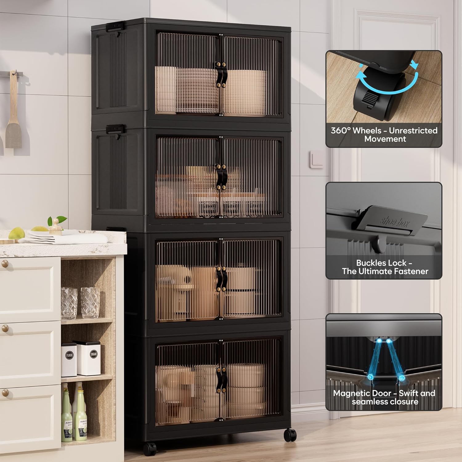 • 【Magnetic Doors & Rotating Wheels】The bins offer two opening options: front or top. The magnetic closure allows easy access. The 4 rotating 360-degree wheels make them easy to move, ideal for use in storage and organization in any room like your closet or bathroom.