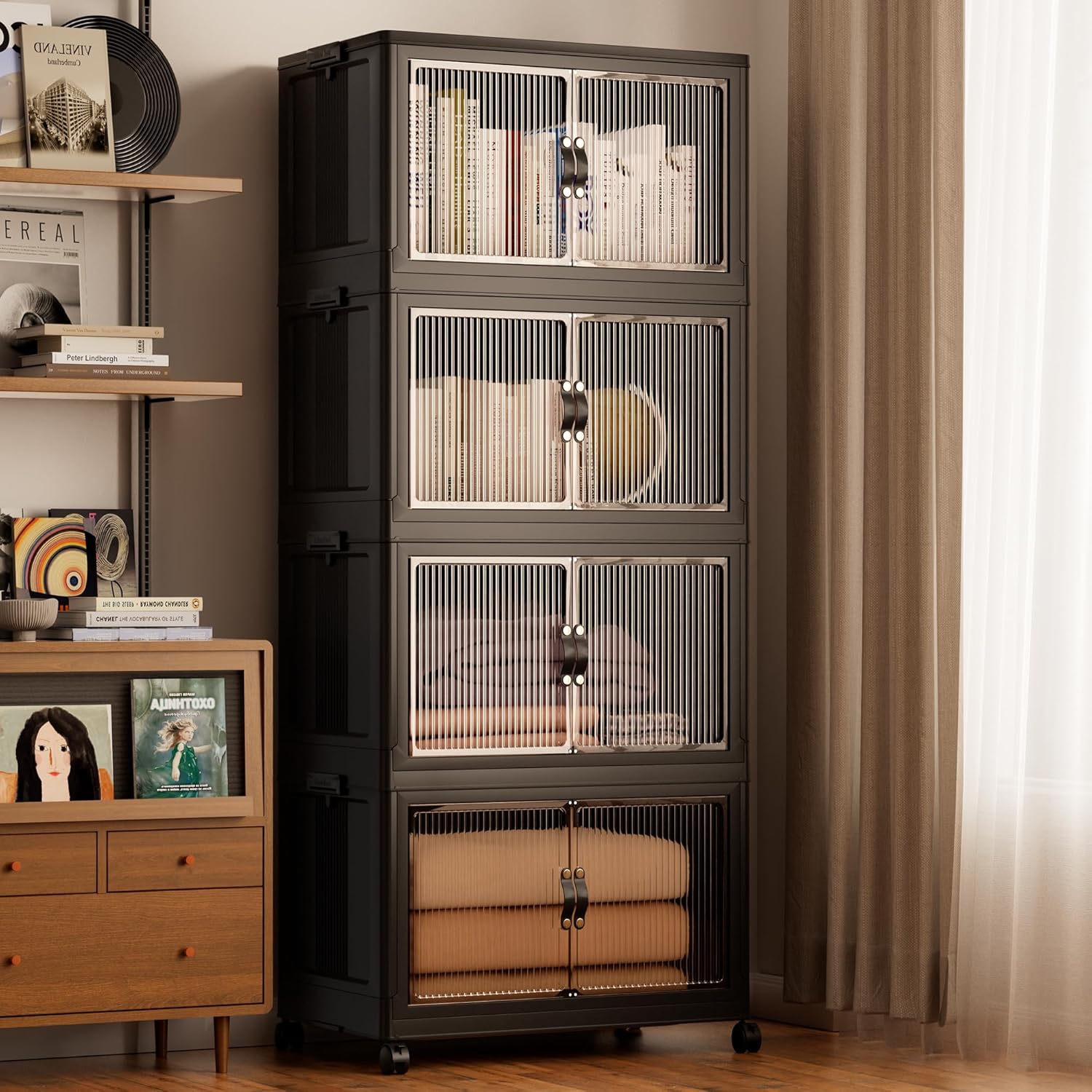 Jalove 50QT Plastic Storage Bins with lids, Stackable Collapsible Storage Containers with Wheels, Closet Organizer and Drawers, Clothes Storage Cabinet for Home Office Garage, 4 Pack Black
