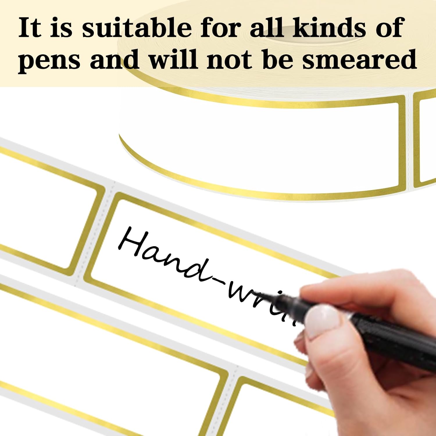 • Packaging: 500 pcs on a roll,Each measures 1” X 3”,Blank and white with gold border