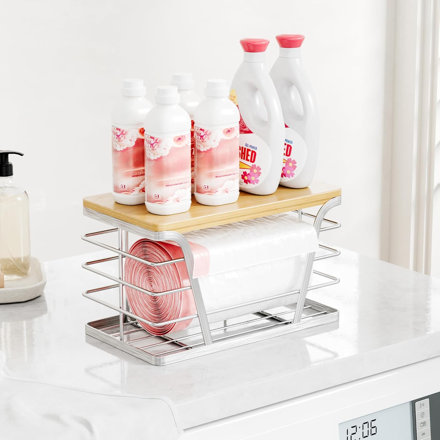 Small Bag Holder,Plastic Bag Holder with Removable Bamboo Top, No Drill, 304 Stainless Steel