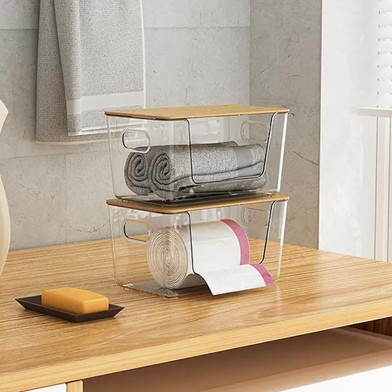 Trash Bag Holders with Bamboo Lids 2 Pack, Garbage Bag Dispenser with Lid, Open Front Stackable Storage Bins, Storage Container for Kitchen, Laundry Organization, Kitchen, Pantry,Under-Sink