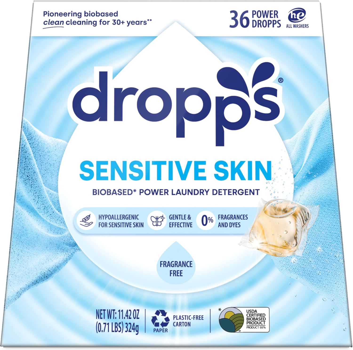 • GENTLE YET STRONG: Dropps Sensitive Skin Laundry Detergent Pods harness the power of bioscience for gentle cleaning, designed for sensitive skin. These pods are formulated with a blend of surfactants to eliminate dirt and stains while being kind to your skin. Each pod is pre-measured for convenience, reducing waste and making laundry easy. These laundry pods are made without fragrances and enzymes to be extra gentle on sensitive skin. Unscented. 36 pods.