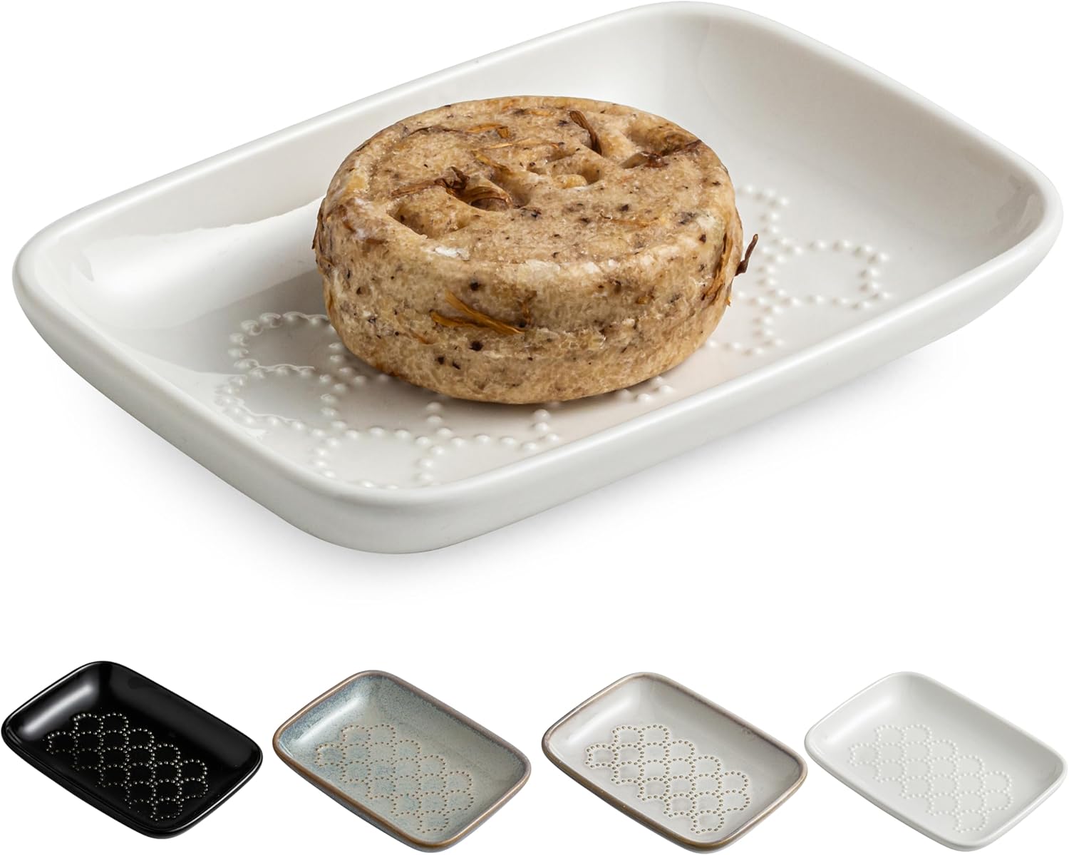 • PREMIUM CERAMIC SOAP DISH: Crafted from premium and enduring ceramic, this soap tray features waterproof, slip-resistant, and heat-resistant properties. Its unglazed bottom ensures the stability of the soap dish and prevents the dish from accidentally slipping into the sink, making it ideal for use on bathroom and kitchen countertops.