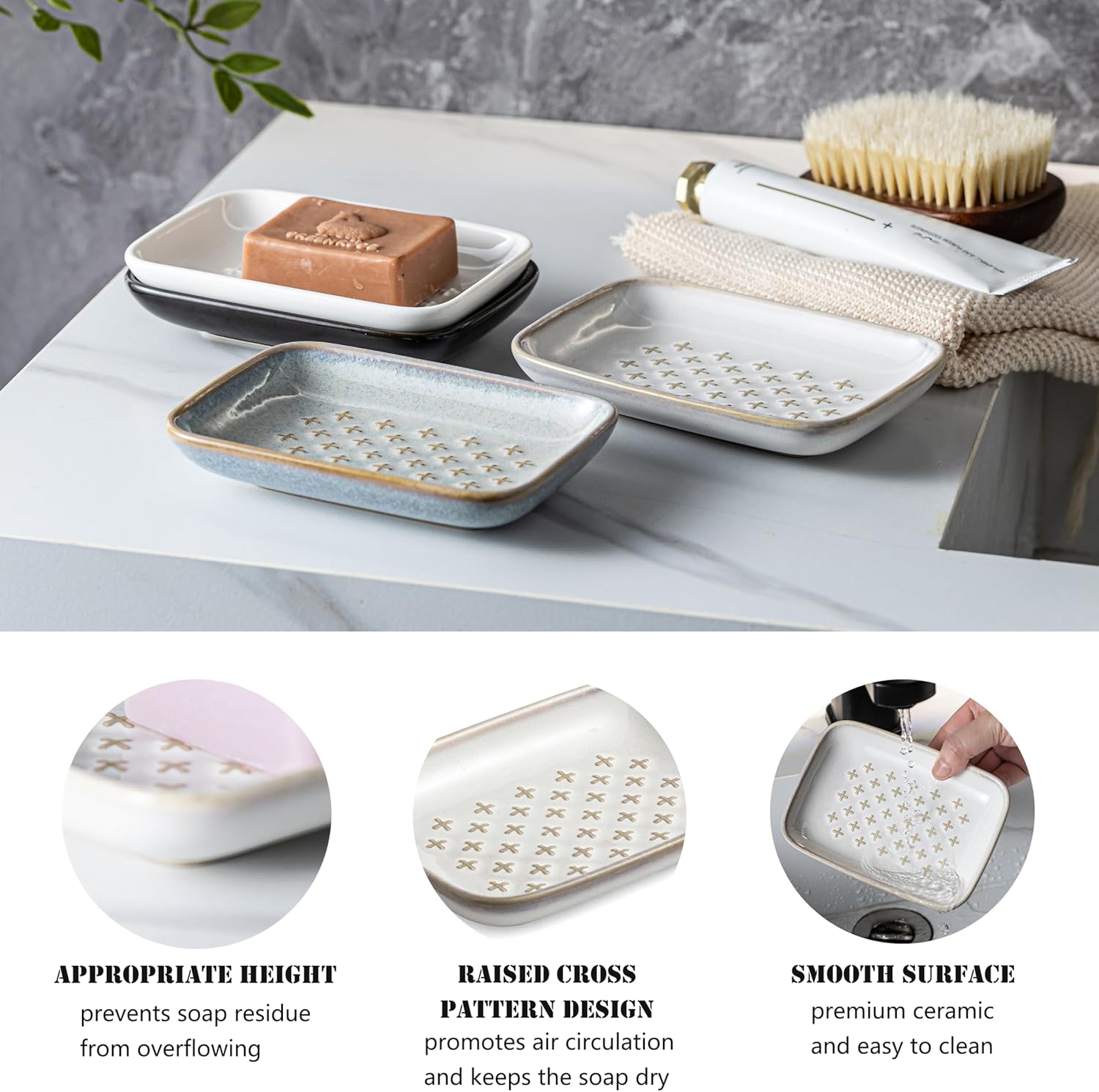 • UNIQUE CROSS PATTERNS DESIGN: Our soap tray featuring a soft beige finish and unique raised cross patterns not only adds to the aesthetic appeal but is also practical. This design ensures your soap remains in place, effectively helps drain water, and prevents it from pooling inside the soap dishes, thus keeping the soap dry and extending its service life.