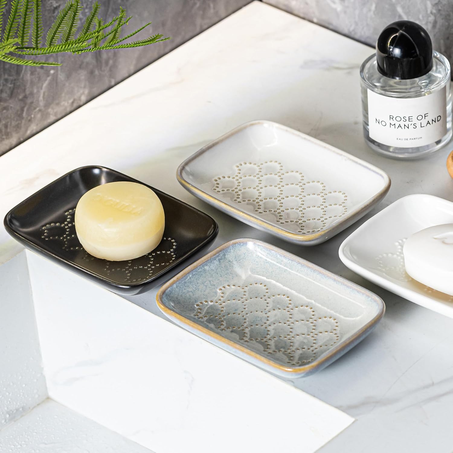 • PREMIUM CERAMIC SOAP DISH: Crafted from premium and enduring ceramic, this soap tray features waterproof, slip-resistant, and heat-resistant properties. Its unglazed bottom ensures the stability of the soap dish and prevents the dish from accidentally slipping into the sink, making it ideal for use on bathroom and kitchen countertops.