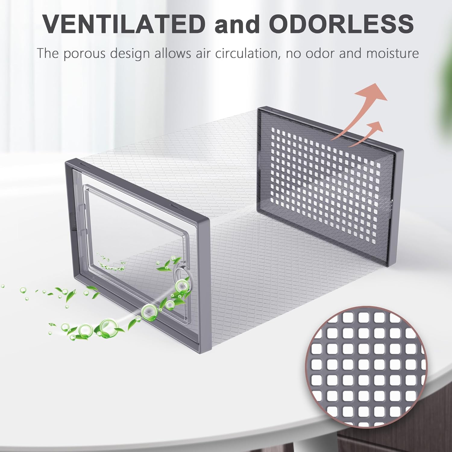 • Sturdy and Ventilation Design: The two lids of the shoe organizer are made of ABS plastic material, which is very stable after assembly. The rear ventilation holes make air circulation and odor prevention