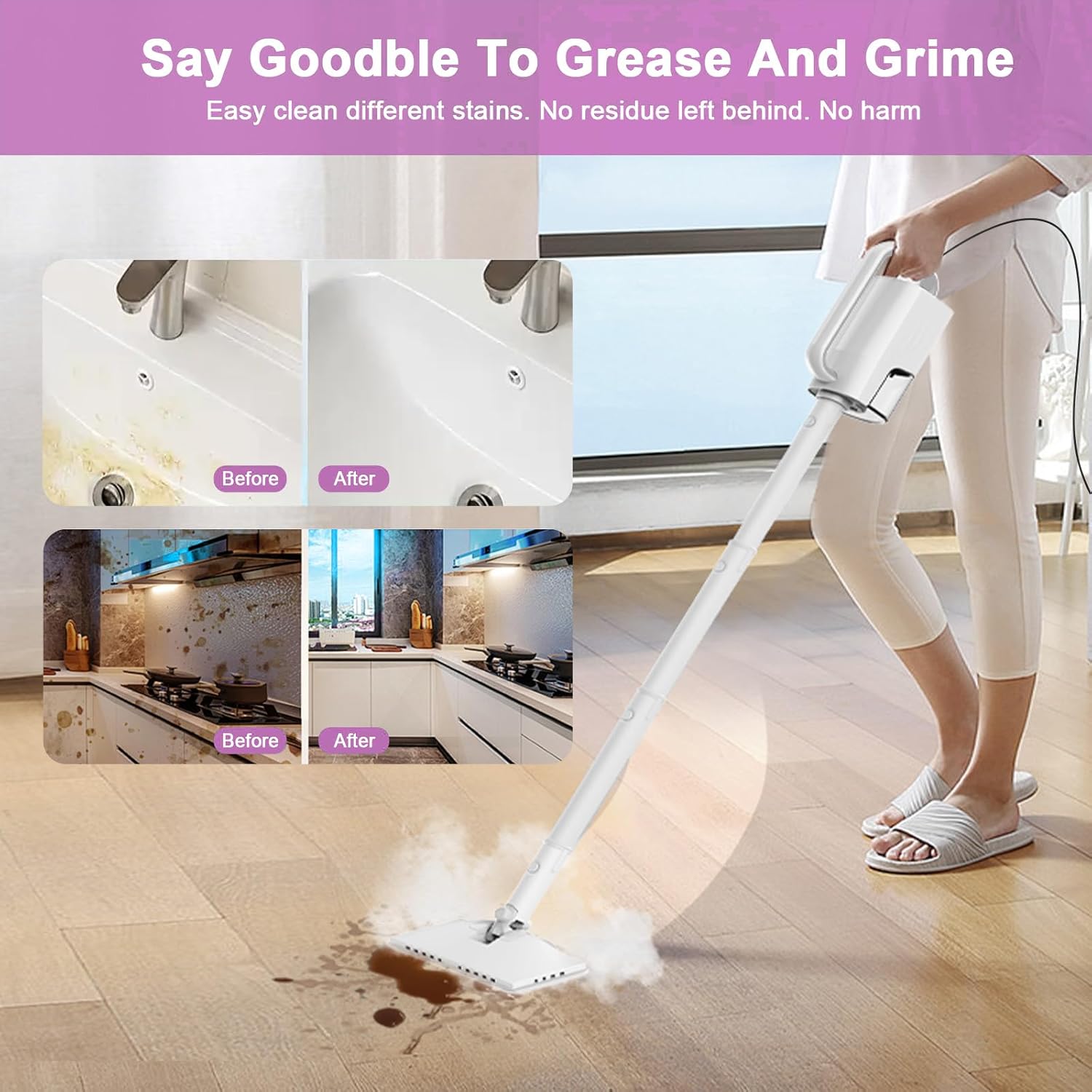 • 🧼 【Fit Multi-Surface and Multi-Purpose Use】 Steam mop with attachments includes 2 machine-washable pads and 7 attachments for floors (hardwood, laminate, tile, marble), windows, showers, kitchens, and even clothing care. Dirt and oil grime, water stains cleaning is not the hard thing again!