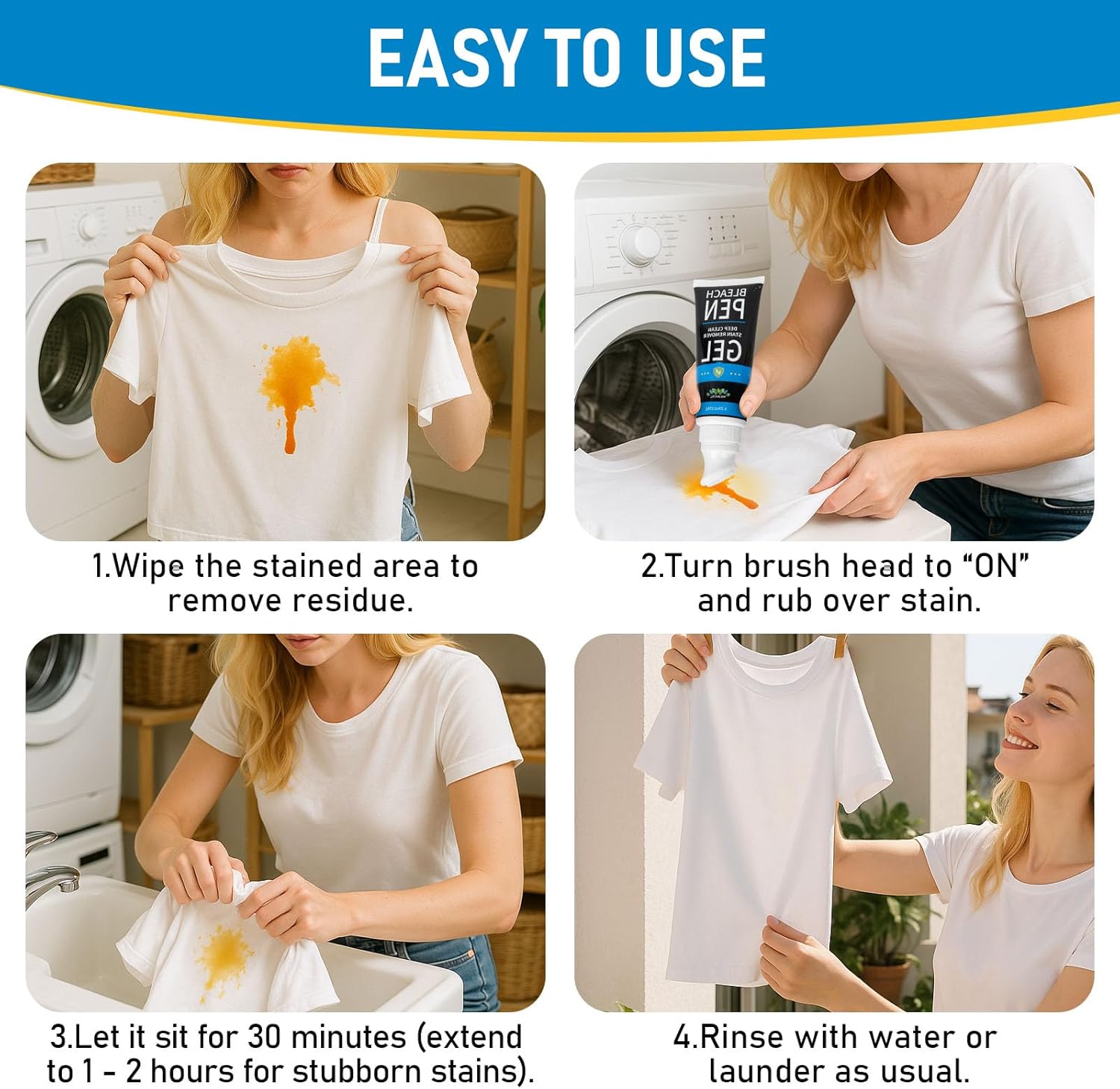 • Easy to Use – Simply wipe residue, twist brush head to ON, apply gel to the stain, let sit for 30–60 mins (up to 2 hrs for tough spots), then rinse or wash as usual.