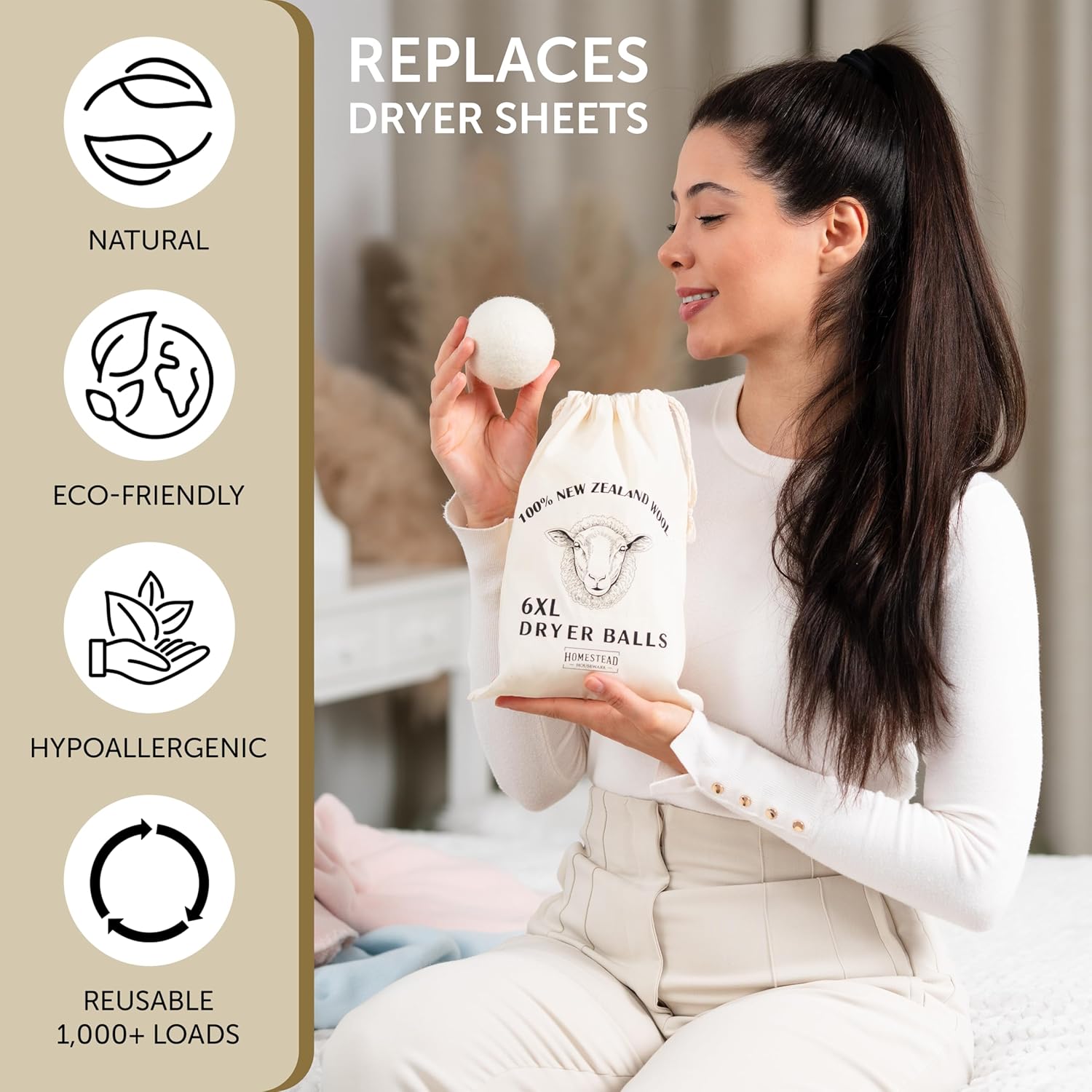 XL Wool Dryer Balls 6-Pack – 100% New Zealand Wool, Natural Fabric Softener & Static Reducer, Reusable Laundry Balls for Pet Hair, Eco-Friendly Dryer Sheets Alternative