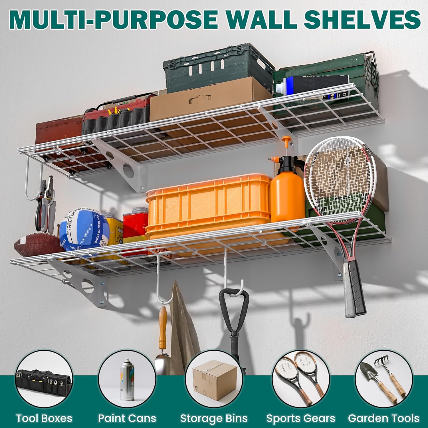 • INCLUDES PREMIUM HOOKS: This wall shelf includes two heavy-duty hooks, each supporting up to 35 lbs—ideal for hanging helmets, shovels, backpacks, and more. These hooks add storage flexibility and make your shelf even more functional and efficient