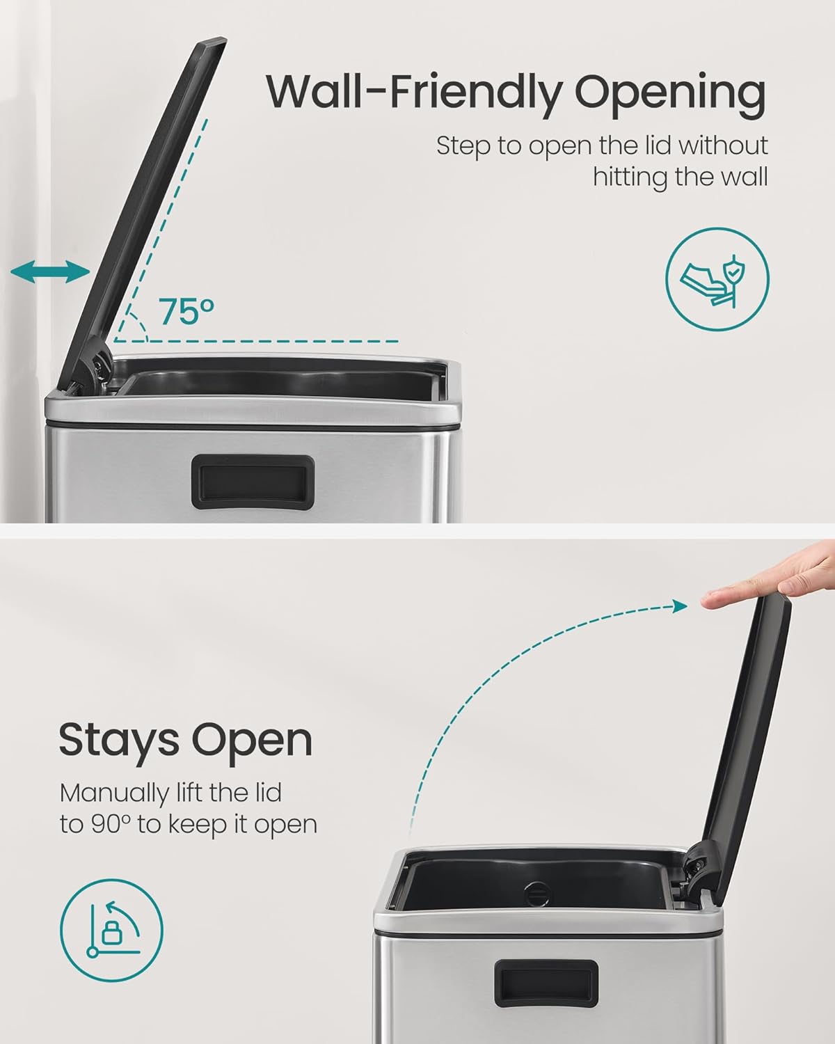 • Hands-Free & Noise-Free: The foot pedal offers a hands-free waste disposal solution, and the soft-close lid is designed to close both slowly and quietly, eliminating any loud noises