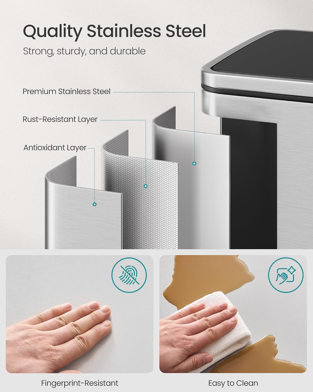 • Built to Last: Constructed from premium stainless steel, this trash can is resistant to both rust and fingerprints, ensuring its durability and long service life
