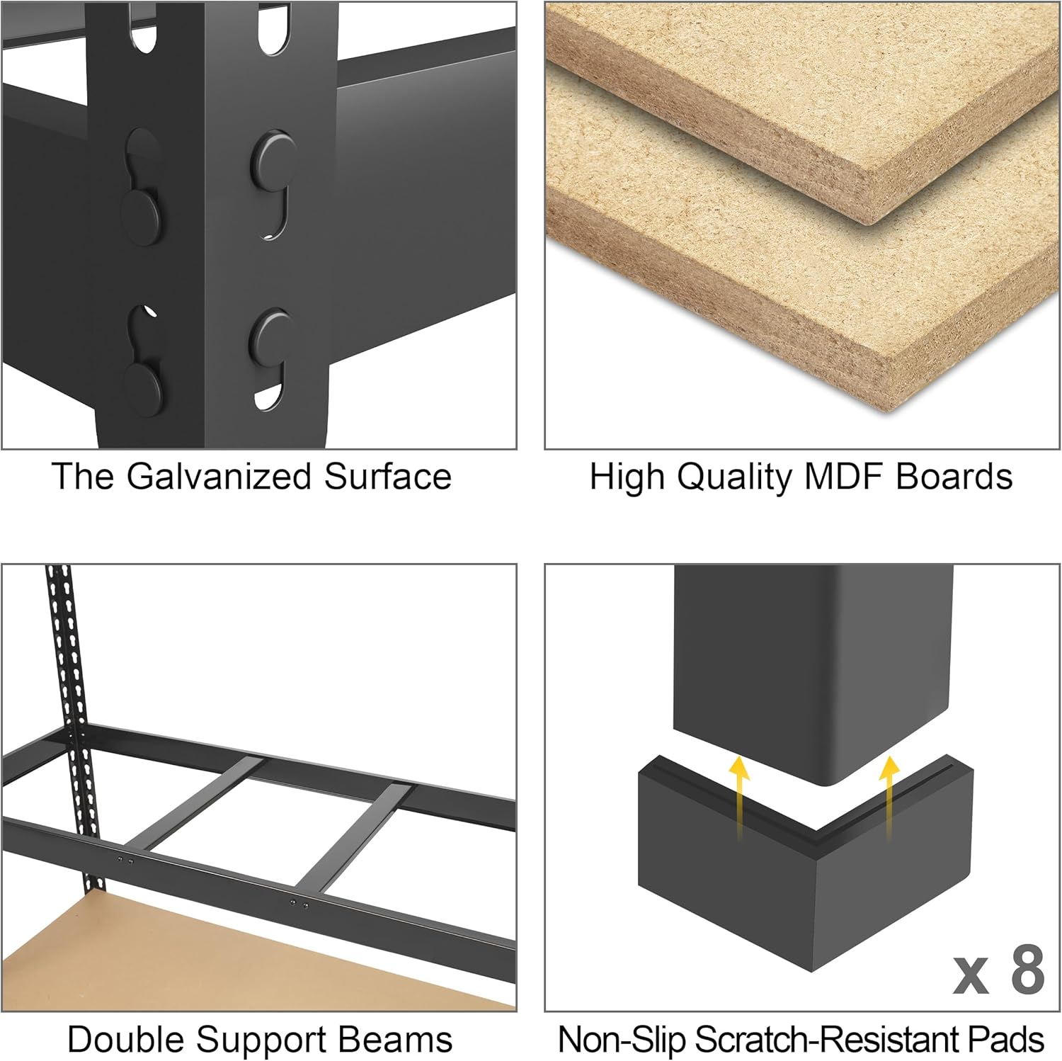 • 【PROTECTIVE RUBBER PADS】: This standing utility shelf is equipped with rubber footpads at the bottom of the legs, which effectively protect the floor from being scratched. To some extent, the footpads also add extra stability and avoid the garage shelves sliding accidentally