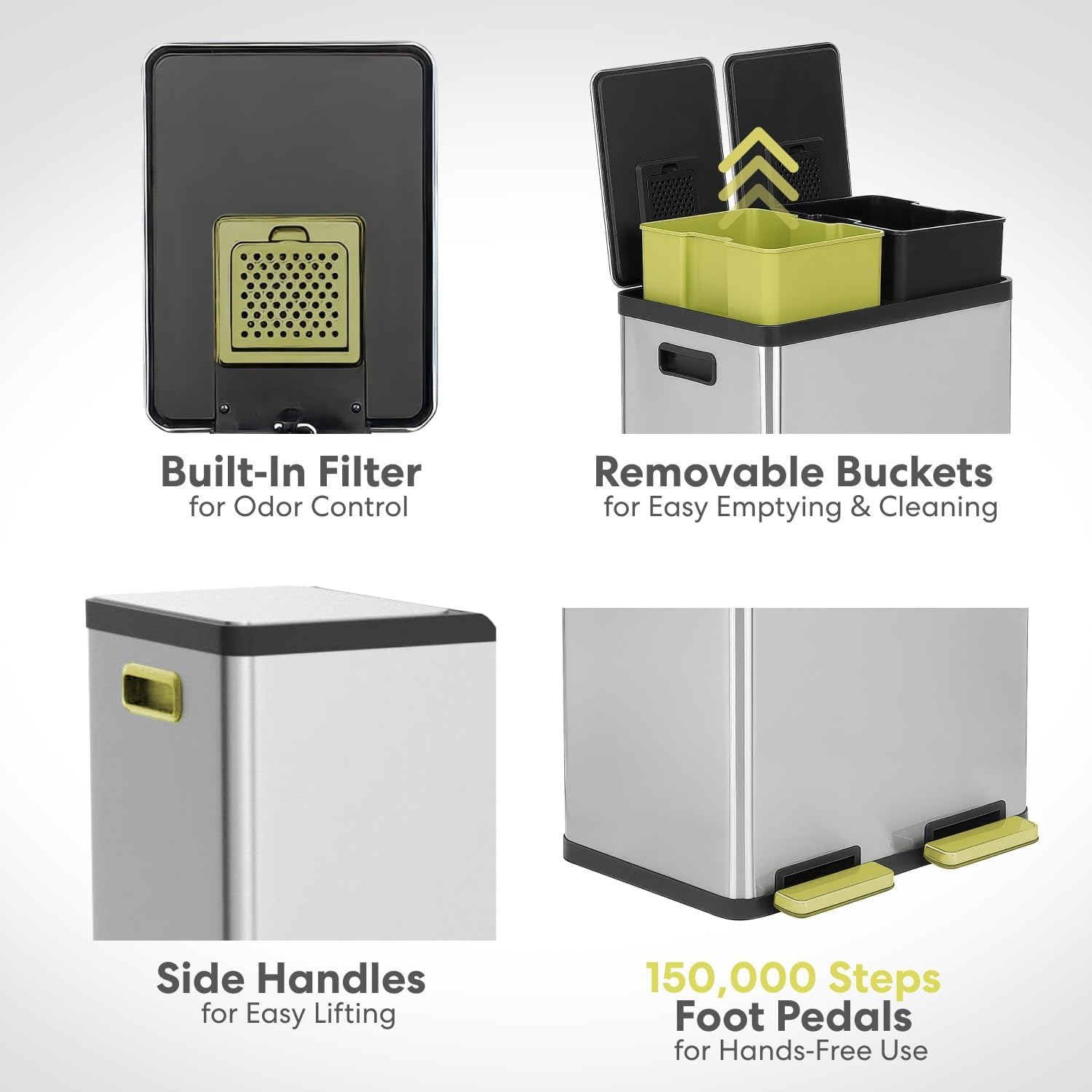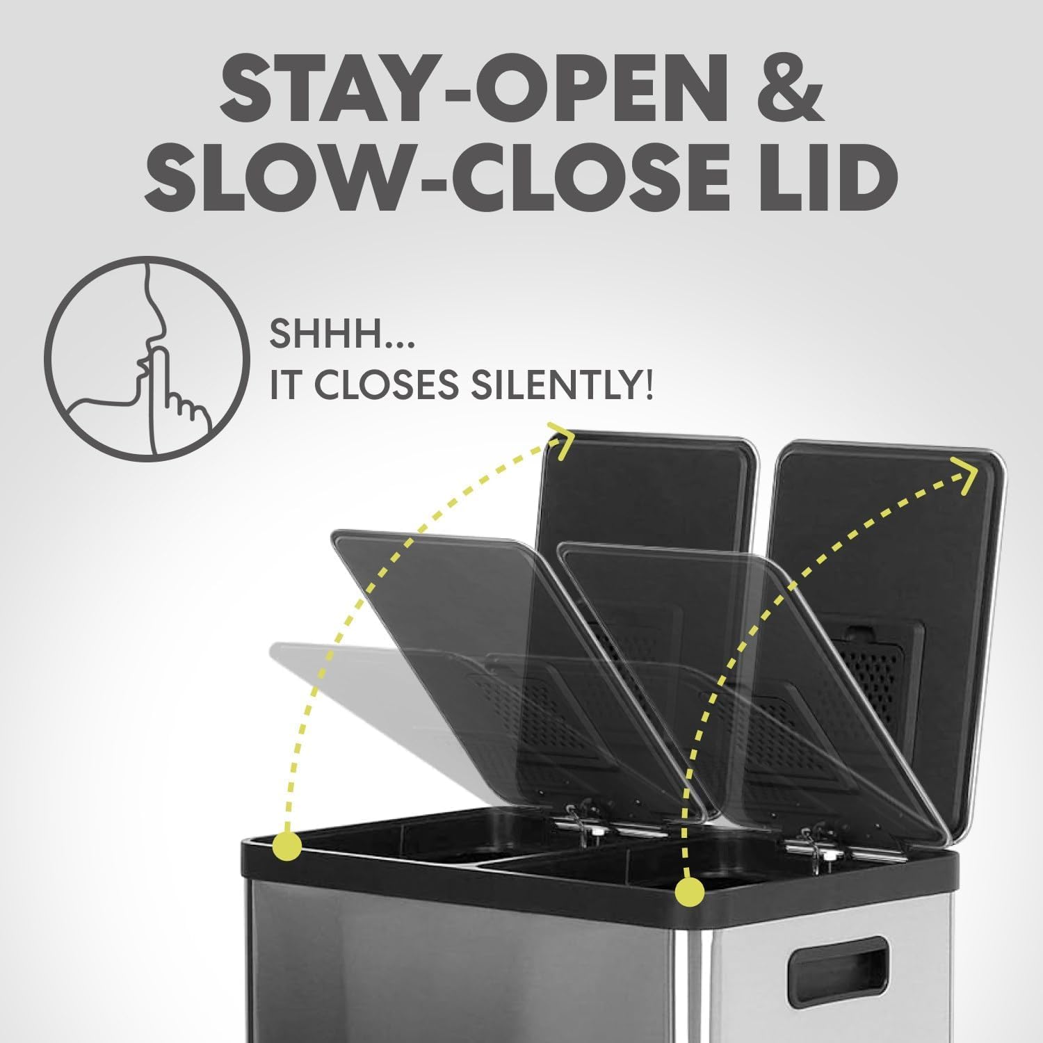 Simpli-Magic 16 Gallon (30L x 30L) Dual Compartment Step Trash Can – Kitchen Garbage Can with Slow-Close Lids – Waste & Recycling Bins, Odor Control, Hands-Free, Easy to Clean, Stainless Steel