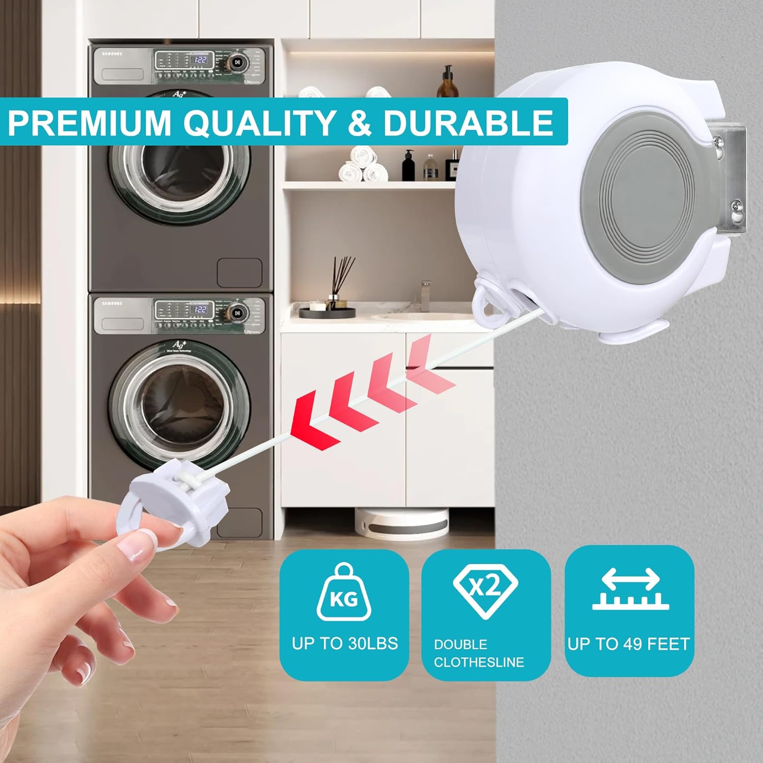 • PREMIMUM QUALITY: This rugged 30lb retractable clothesline comes fully assembled with ABS case that laughs at sun, rain, and drops – just mount it anywhere in seconds, stretch its 49ft muscle to hang king-size comforters or 20 soaking towels