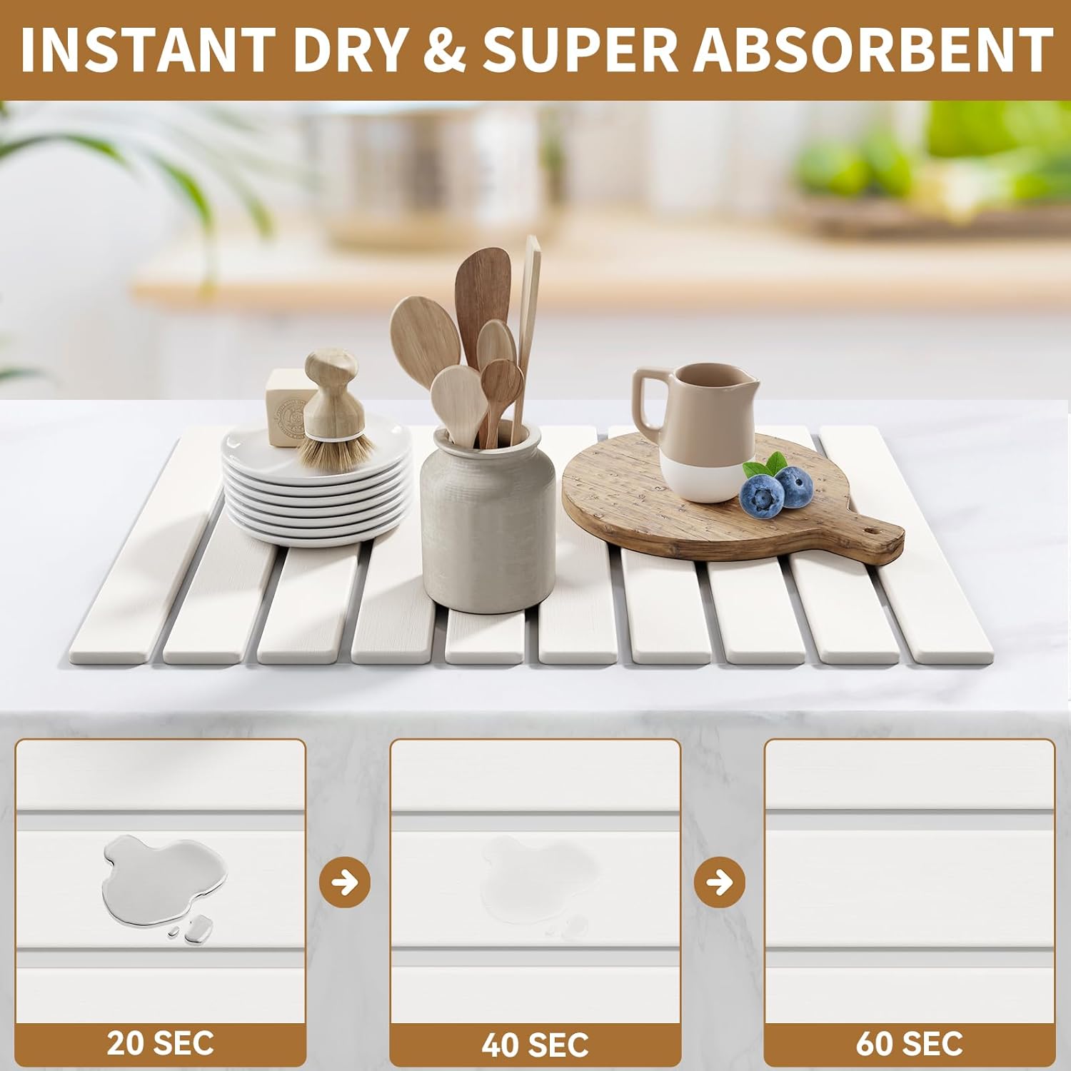 • Super Absorbent & Quick Dry:Our premium diatomite dish mat is the perfect quick drying stone mat that absorbs spills instantly and dries fast, keeping your countertop dry, clean, and free from moisture buildup. No more soggy mess—just a sleek, dry surface in minutes with this naturally efficient drying mat.