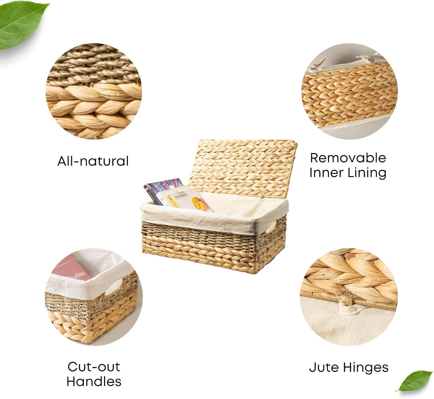 • 🌿 HANDWOVEN NATURAL BEAUTY: Expertly crafted from natural water hyacinth, these hand woven wicker baskets with lids and soft inner linings bring rustic elegance to any space, adding warmth and texture as stunning decorative storage solutions for shelves, countertops, or tabletops.