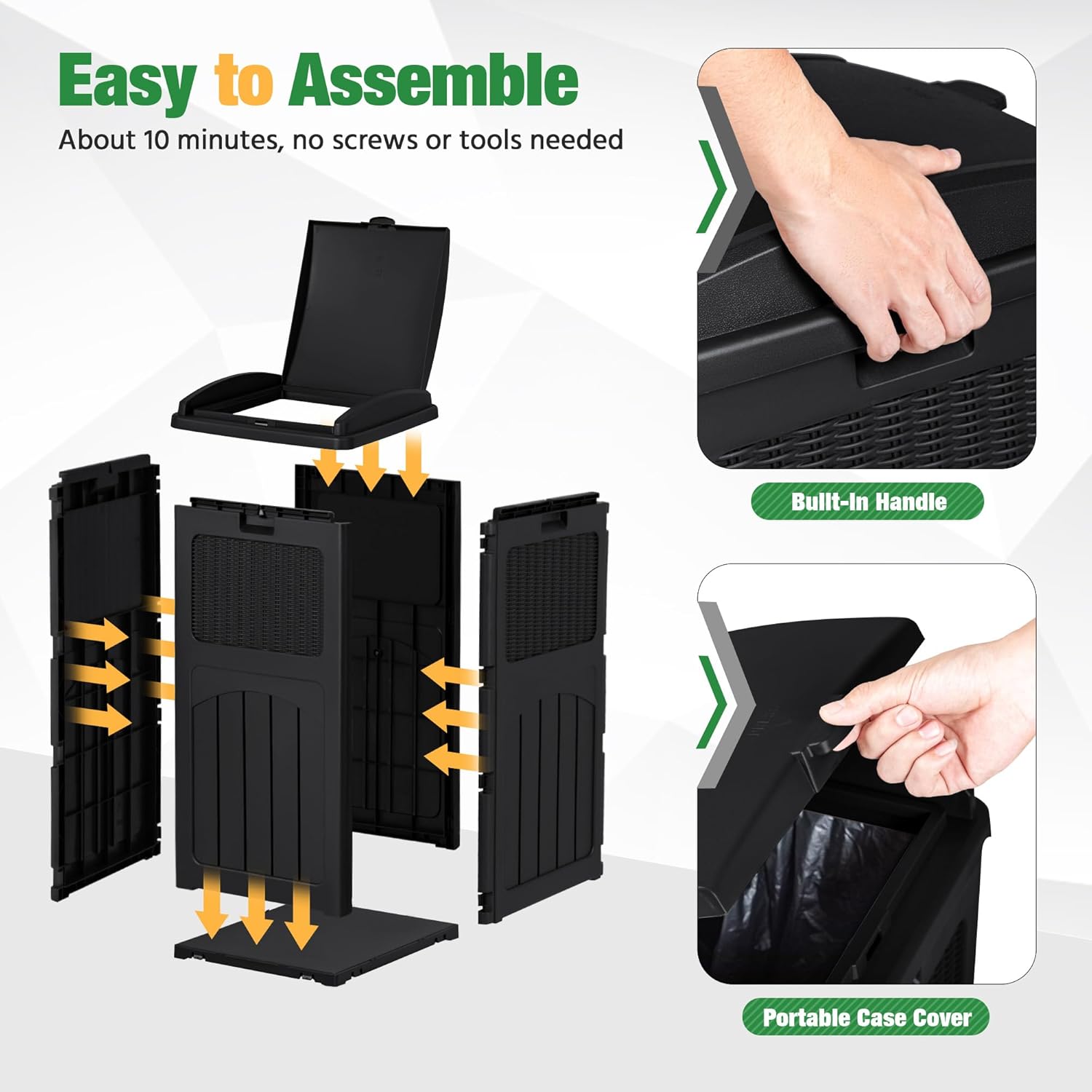 • Easy to Install Trash Bags: The waste bin for outdoors is compatible with 30-33 gallon trash bags. You need to lift the trash bag holder, put on the trash bag, put down the holder, and then finish the installation. After opening the inner lid, the garbage bag can be stably fixed in the card slot