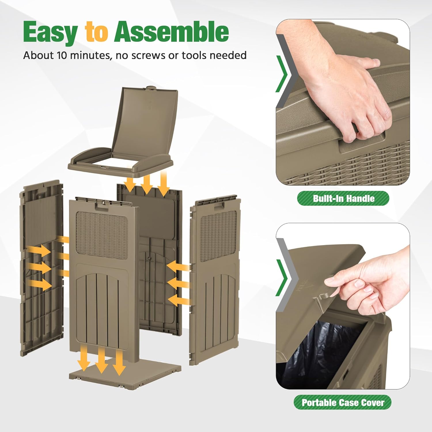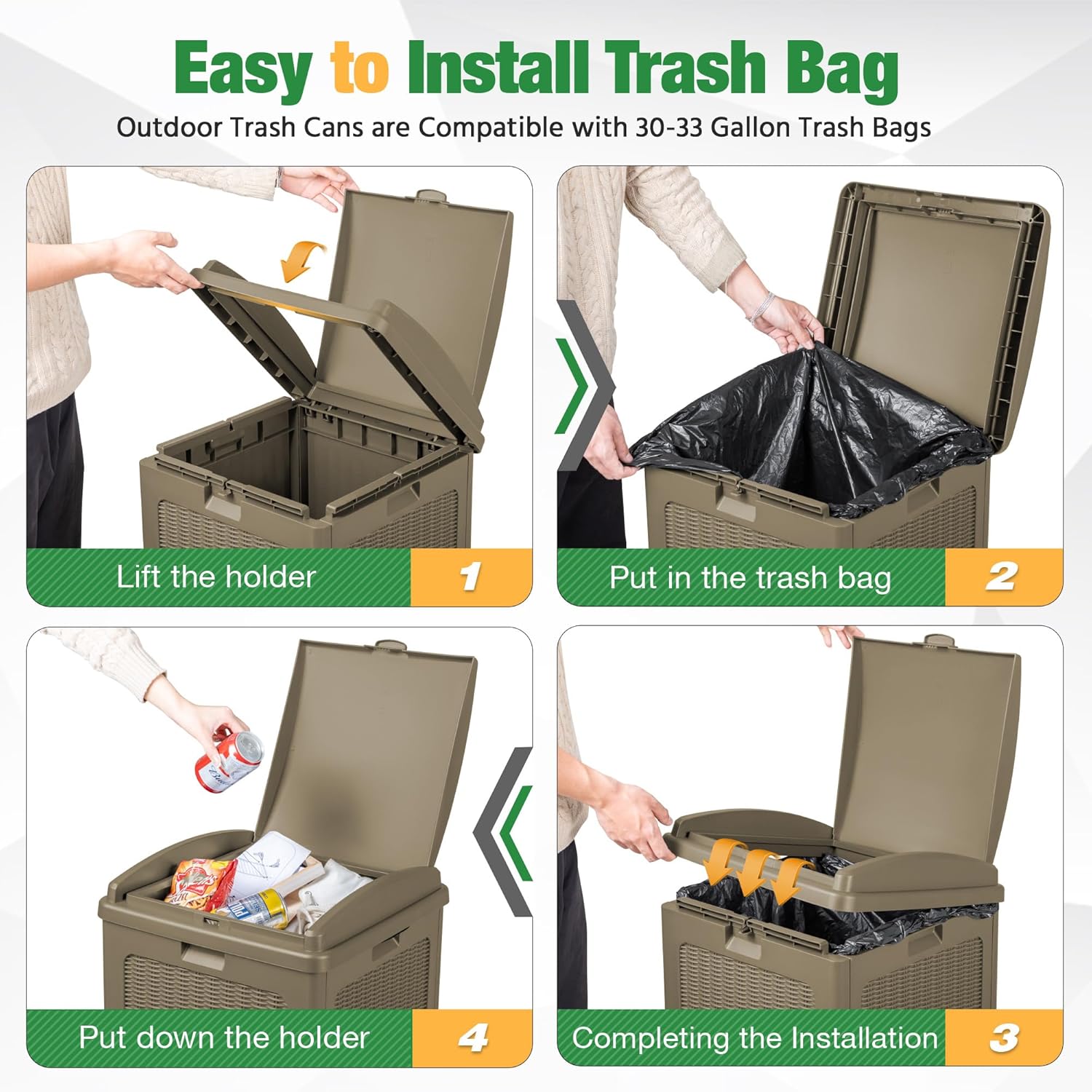 • Easy to Install Trash Bags: The waste bin for outdoors is compatible with 30-33 gallon trash bags. You need to lift the trash bag holder, put on the trash bag, put down the holder, and then finish the installation. After opening the inner lid, the garbage bag can be stably fixed in the card slot