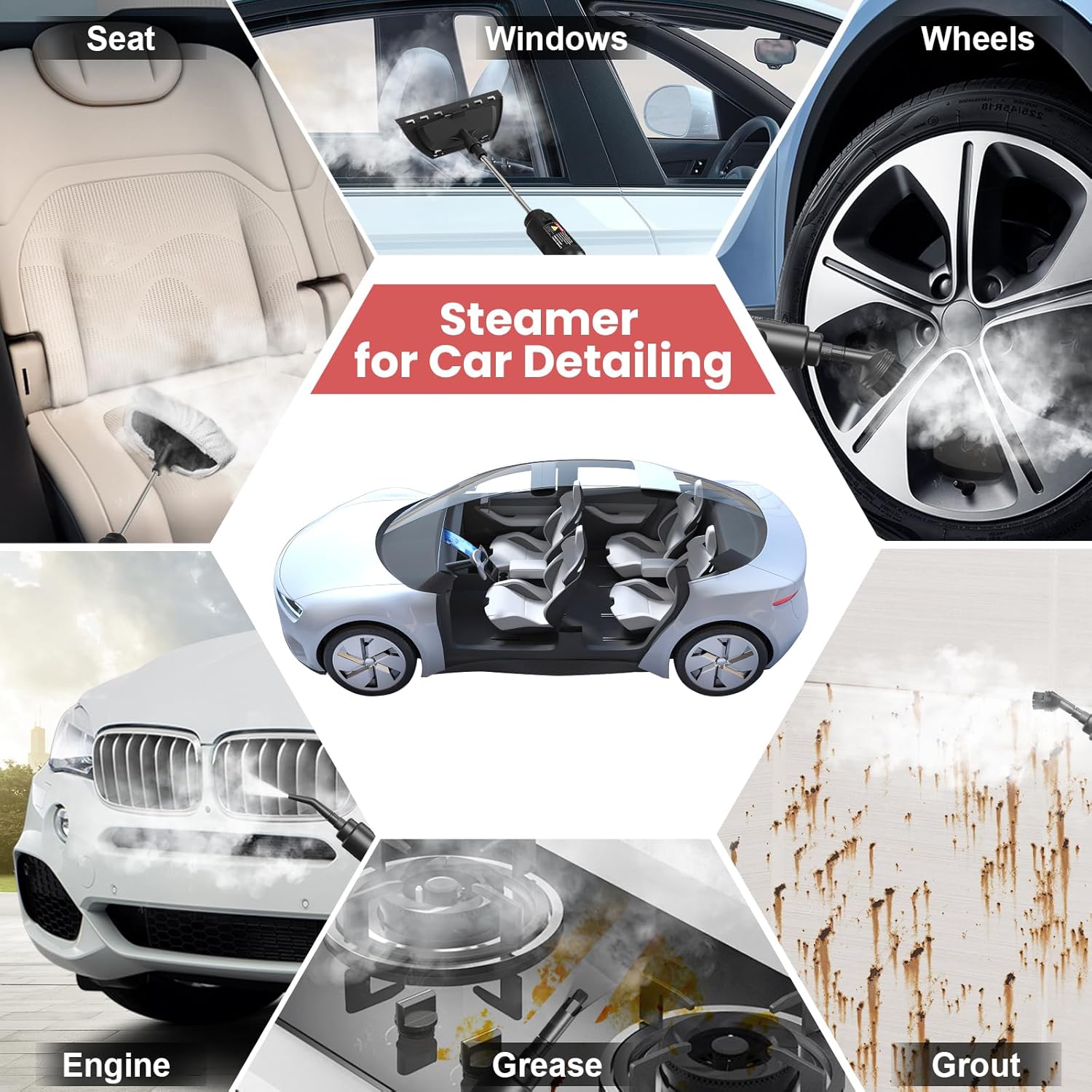 • Steamer Cleaner for All Surfaces: This steamer cleaner for all surfaces works on tile, grout, windows, car seats, kitchen hoods, upholstery, and more. Whether you're refreshing furniture, detailing your car, or cleaning your bathroom, it functions as a portable steam cleaner for all Surfaces