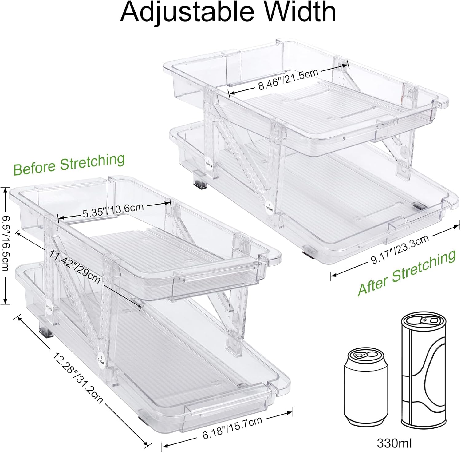 • Unique Adjustable Design: Our double-layer beverage organizer features a cleverly designed adjustable width, allowing you to customize the space to fit bottles, cans, or cups of varying heights. It’s perfect for organizing your drinks in style and efficiency.