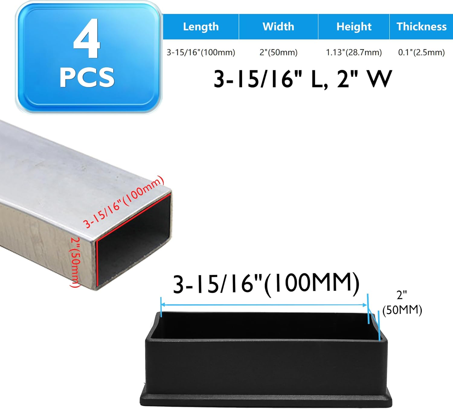 • Dimension and Quantity: 4 black rectangular chair leg floor protectors, suitable for 1.96"x3.93"(50x100 mm) OD rectangular chair legs; We offer different size options,including 1" x 4" rectangular chair feet, allowing you to find the perfect fit for your specific needs (Please confirm that you are measuring the outside, not the hole)