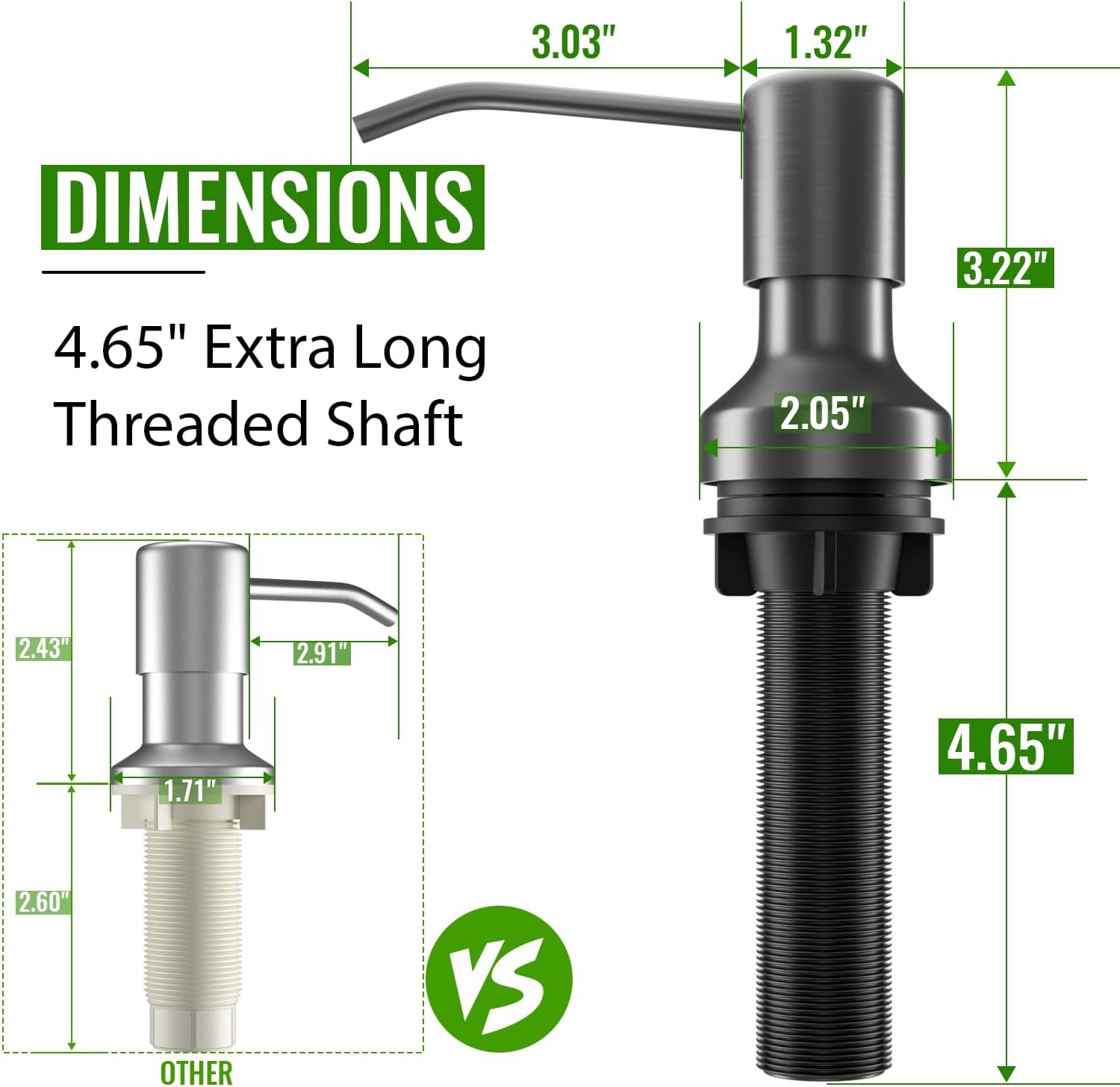 • Extra Long Threaded shank shaft:4.65 " threaded shank of soap dispenser can pass through most of deep countertops, like marble, stainless steel, wood or grantie. So it can also be used as a bathroom countertop soap dispensers. No worry about the thickness of your kitchen countertop.