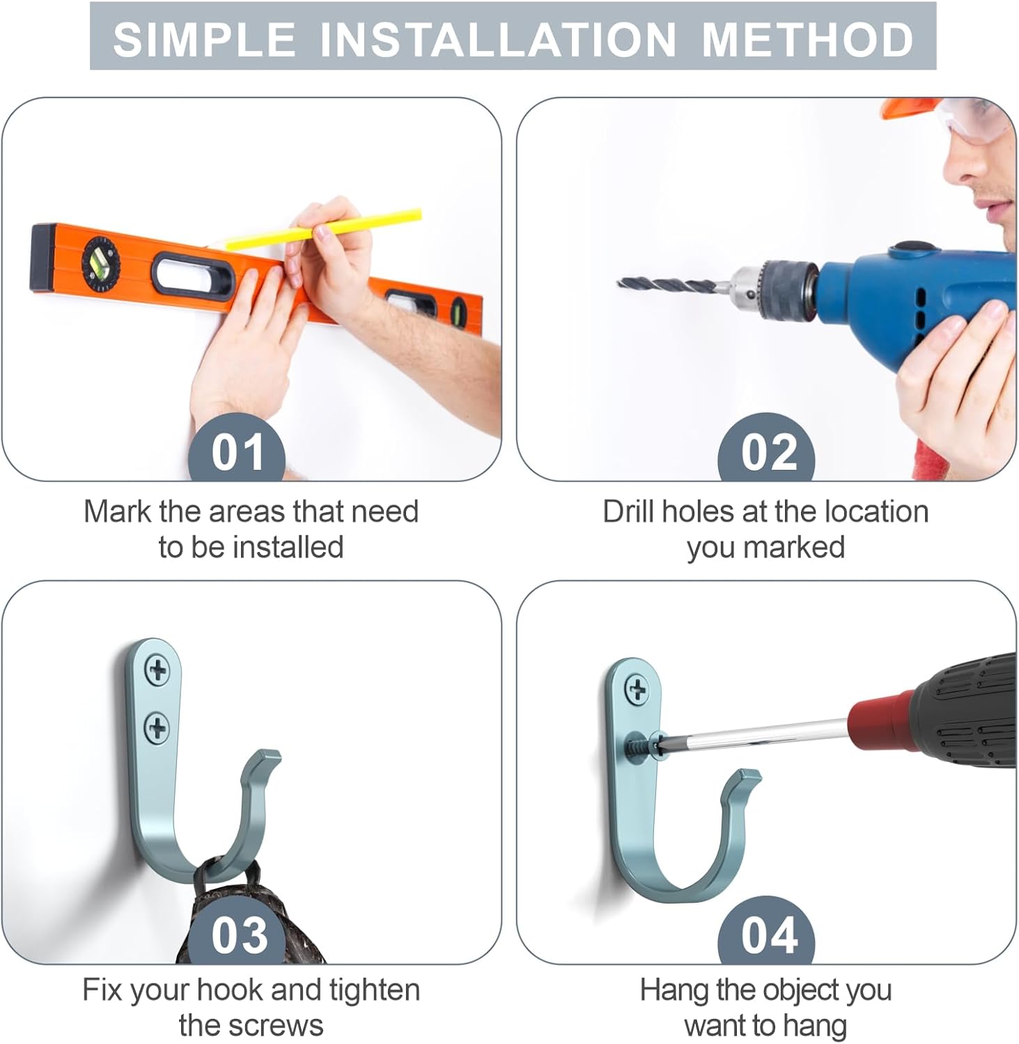 • Quality Upgrade: For the problem of deformation of wall hooks, we have upgraded the material, increased the iron content, so that the quality and hardness of wall hooks and screws are greatly enhanced, it has the function of anti-corrosion and anti-rust, making them strong and durable