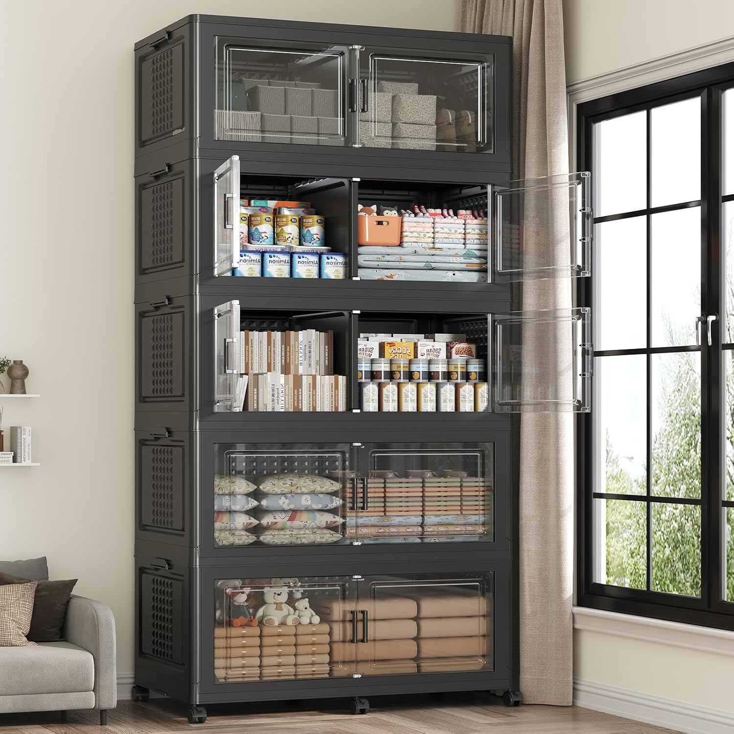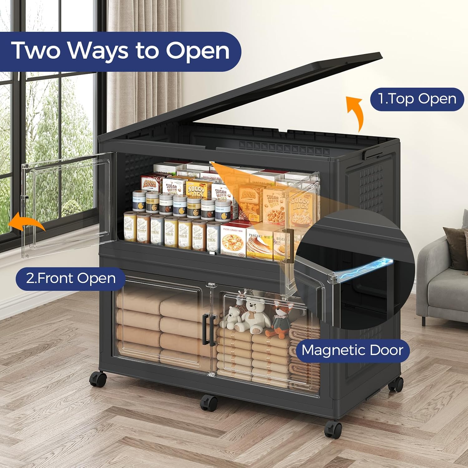 • 【Two Ways to Open & Clear Magnetic Doors】Fangtueh collapsible storage bins with lid and wheels feature a dual access way, allowing for both top and front door openings, and with clear windows for easy visibility. The stackable plastic storage bins with open front doors are equipped with magnetic lock buckles to prevent dust from entering the cabinet.